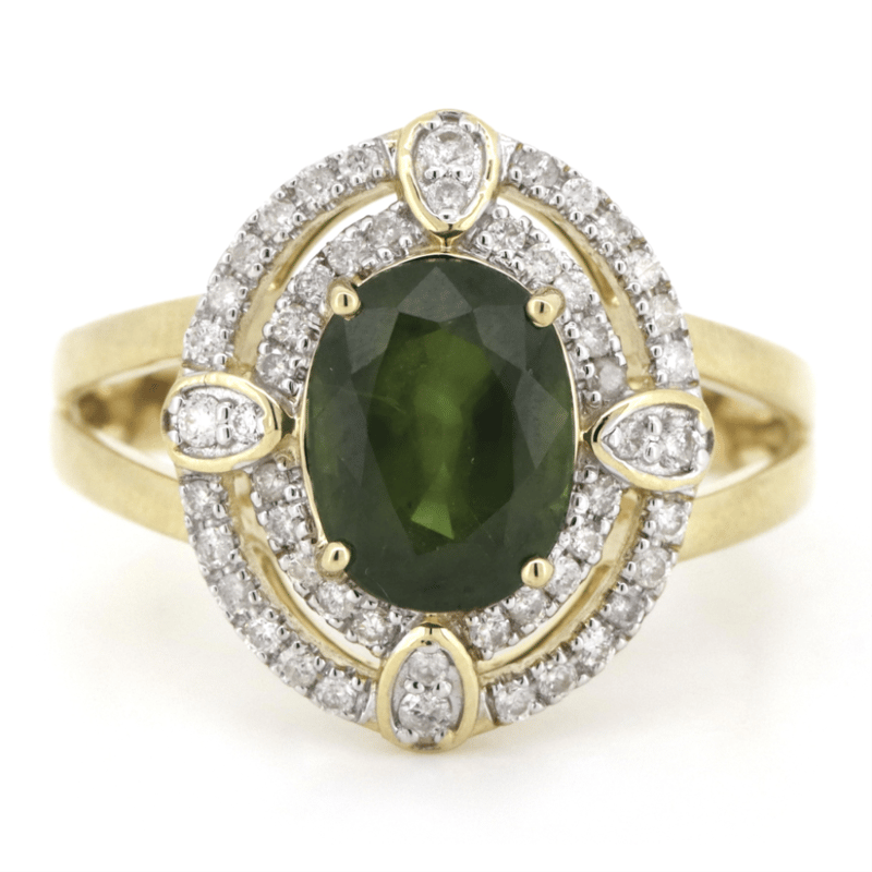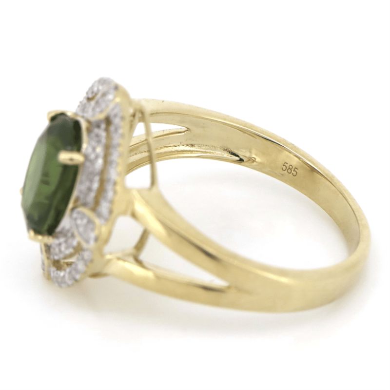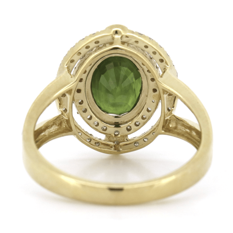 14K YELLOW GOLD, GREEN SAPPHIRE AND DIAMOND, DOUBLE HALO SPLIT BAND RING.