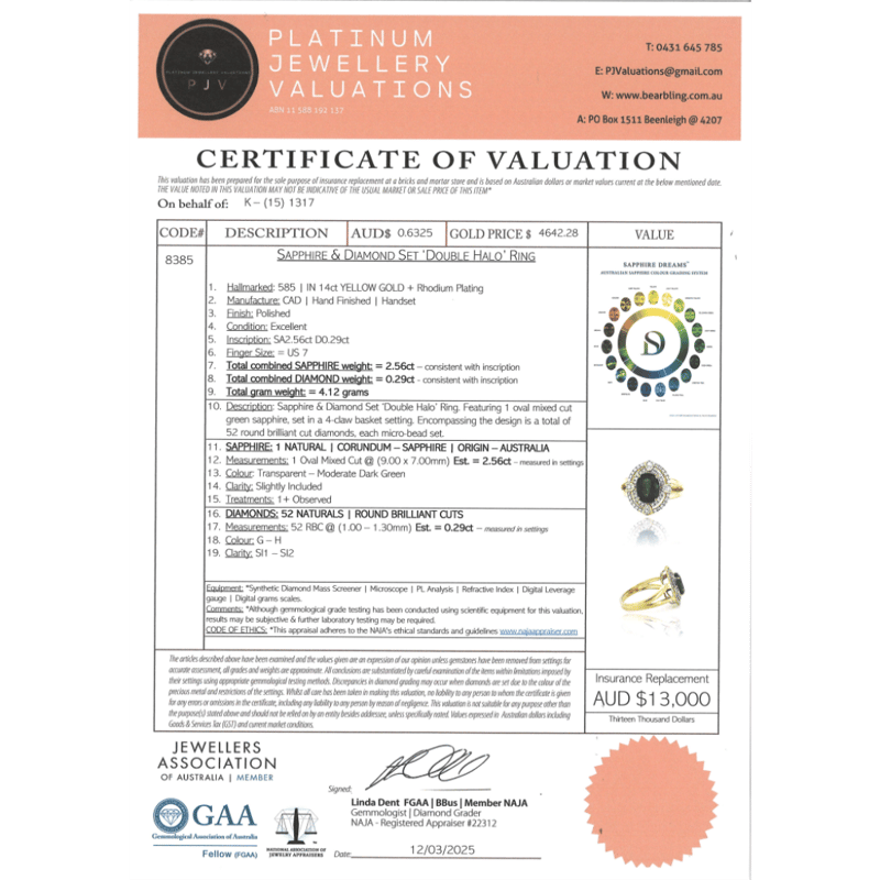 The Centre Features, One Oval Cut, Moderate Dark Green, Sapphire (2.56Ct, Slightly Included), 4 Claw Set. Surrounding The Centre In A Double Halo Are, 52 Round Brilliant Cut, Diamonds (0.29Ct Tdw, G-H Colour, Si1-Si2 Clarity), Micro-Bead Set. Ring Size N.