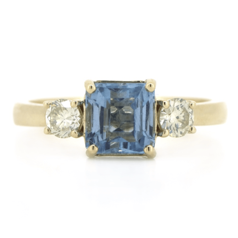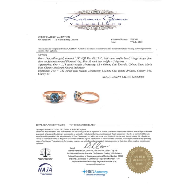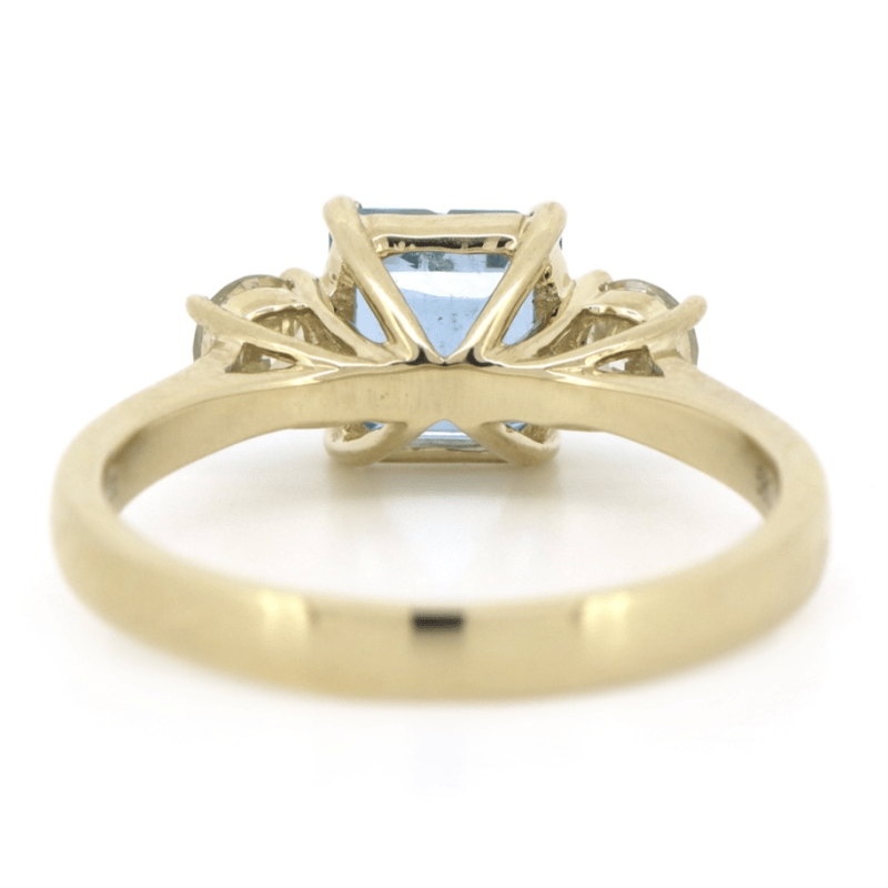 14K YELLOW GOLD, AQUAMARINE AND DIAMOND, TRILOGY RING. The Centre Features, One Emerald Cut, Santa Maria Blue, Aquamarine (1.38Ct, Moderate Natural Inclusions), 4 Claw Set. Flanking Either Side Of The Centre Are, 2 Round Brilliant Cut, Diamonds (0.33Ct Tdw, L-M Colour, Si Clarity), 4 Claw Set. Ring Size M. Valuations Provided by an Independent Third-Party Professional Not Directly Associated With Lloyds Auctions at AUD $$10,000.00This valuation has been conducted by an independent third-party professional. The valuation amount is an assessment by the issuing valuer and does not reflect the auction value of the item. Any inquiries regarding the valuation should be directed to the issuing valuer (refer to contact details on the certificate), as Lloyds Auctions has no affiliation or influence over the valuation, the valuer, or the stated amount. Condition: Good - Refer Images 0645967+21