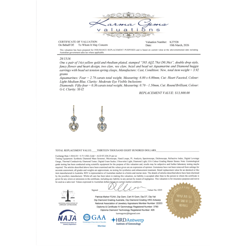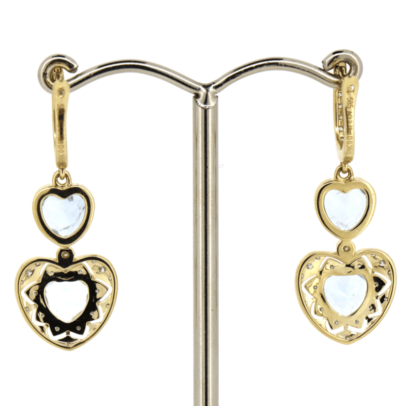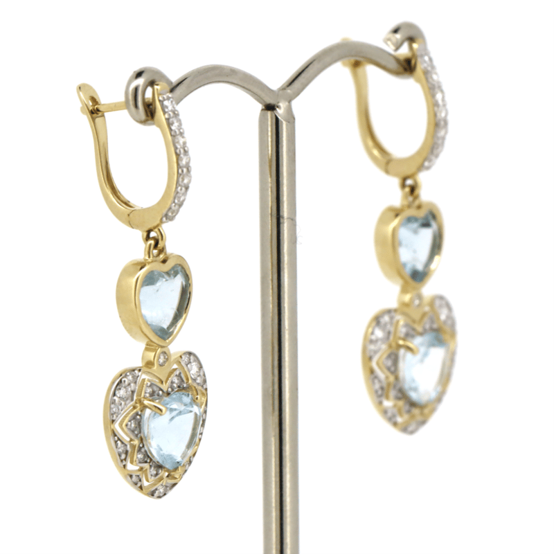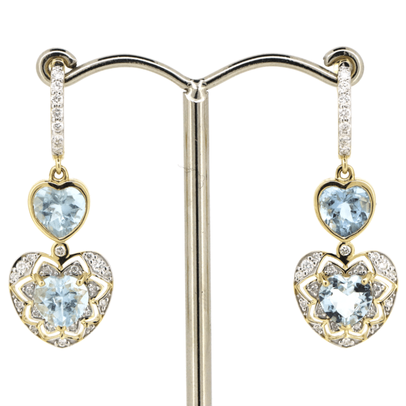 The Earrings Feature, 4 Heart Faceted Cut, Aquamarines (2.78Ct Tsw, Moderate Eye Visible Inclusions), Claw/Bezel Set. Encompassing The Centre And Decorating The Hooks Are, 54 Round Brilliant Cut, Diamonds (0.36Ct Tdw, G-I Colour, Si-I2 Clarity), Claw Set. The Earrings Feature Tension Spring Clasps.