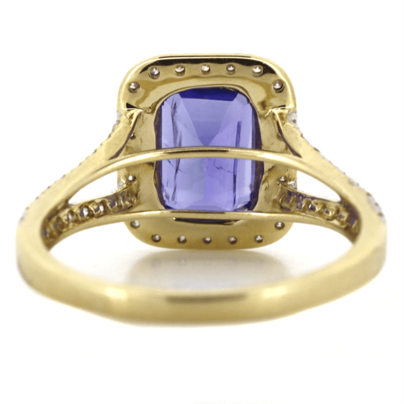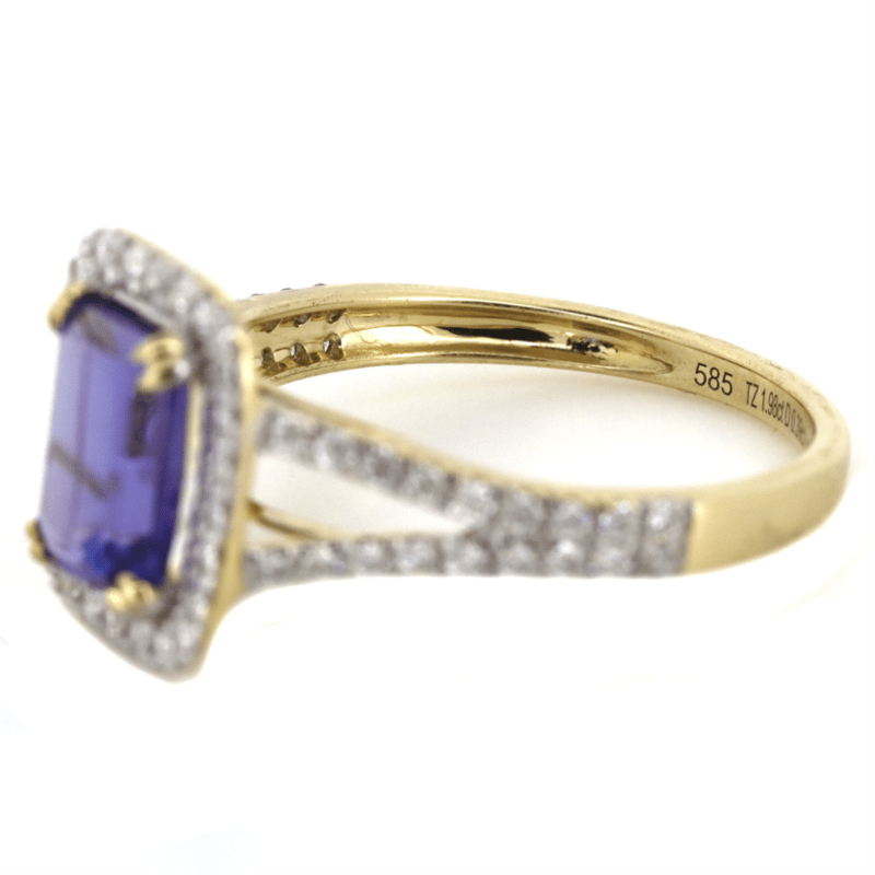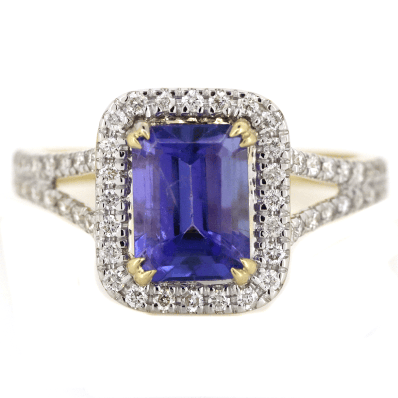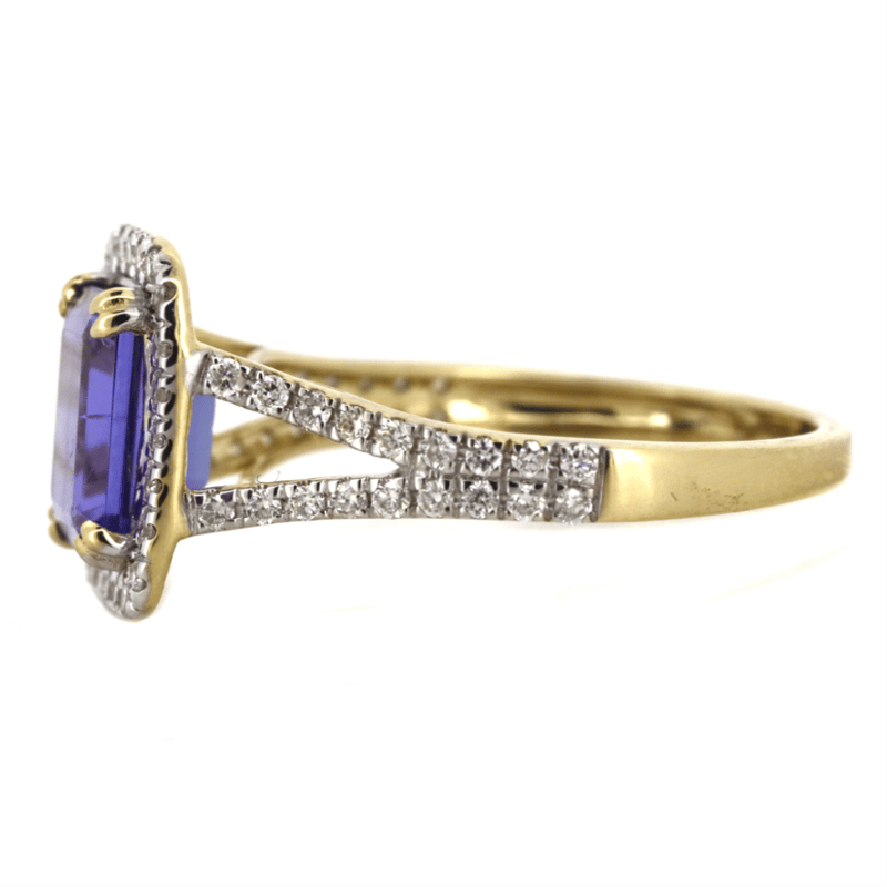 14K YELLOW GOLD, TANZANITE AND DIAMOND, HALO SPLIT BAND RING.