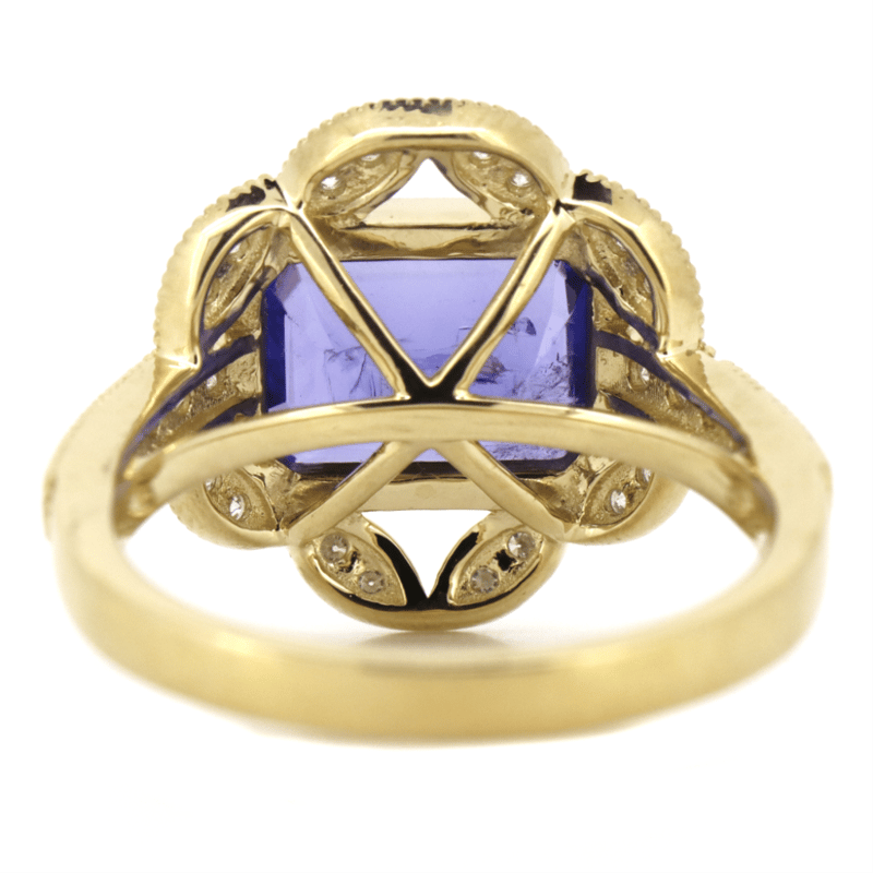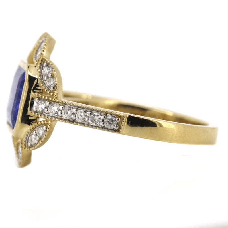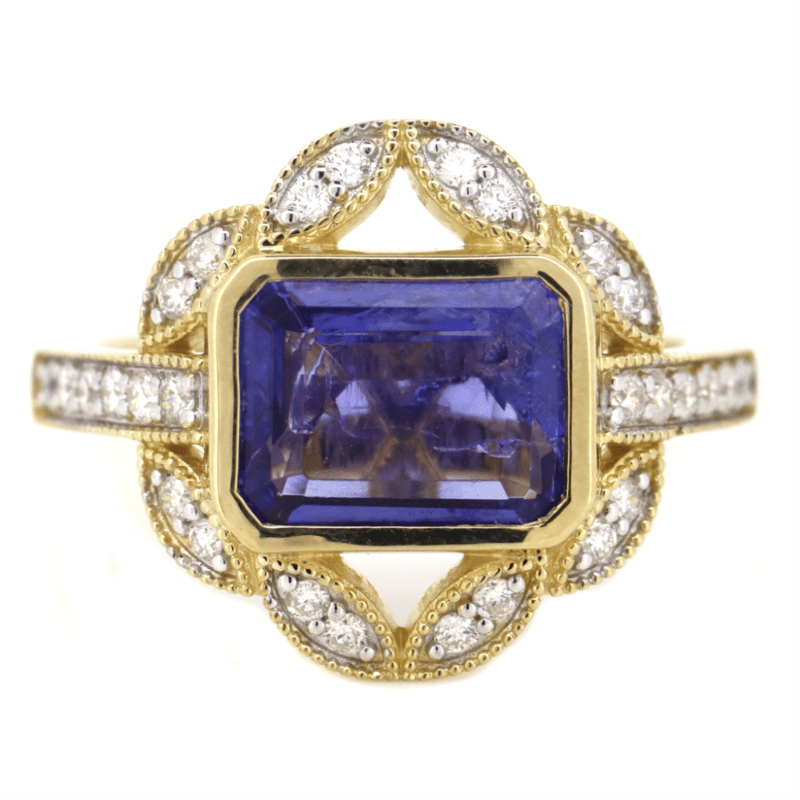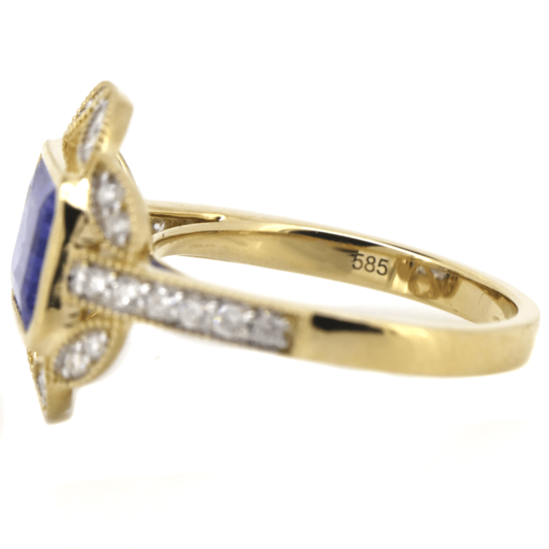 14K YELLOW GOLD, TANZANITE AND DIAMOND, ANTIQUE INSPIRED RING.