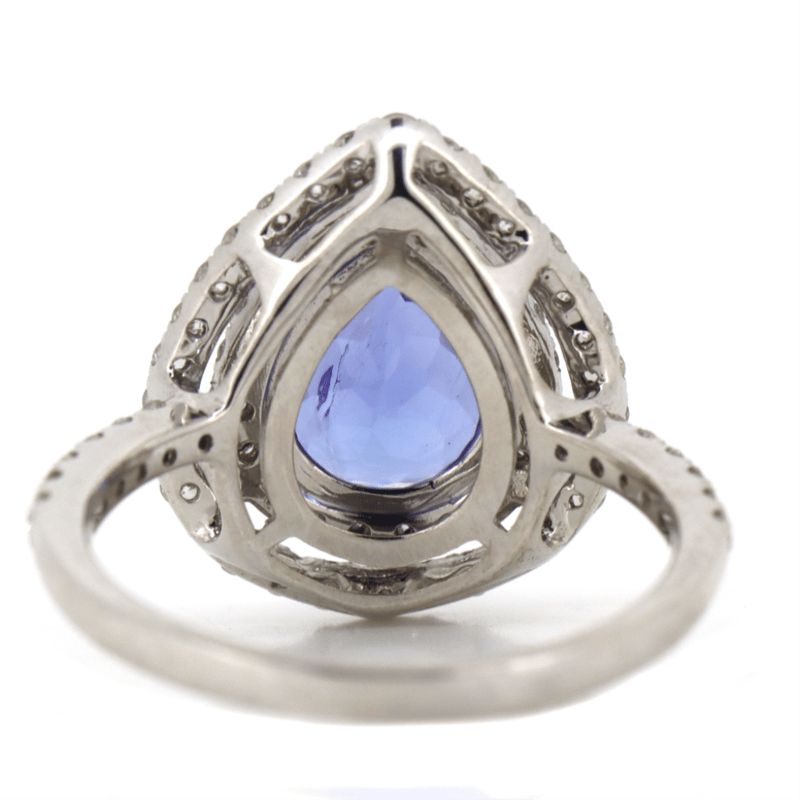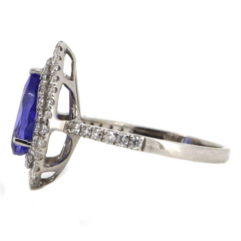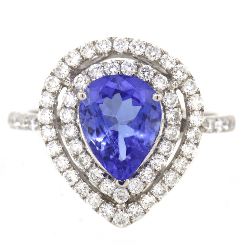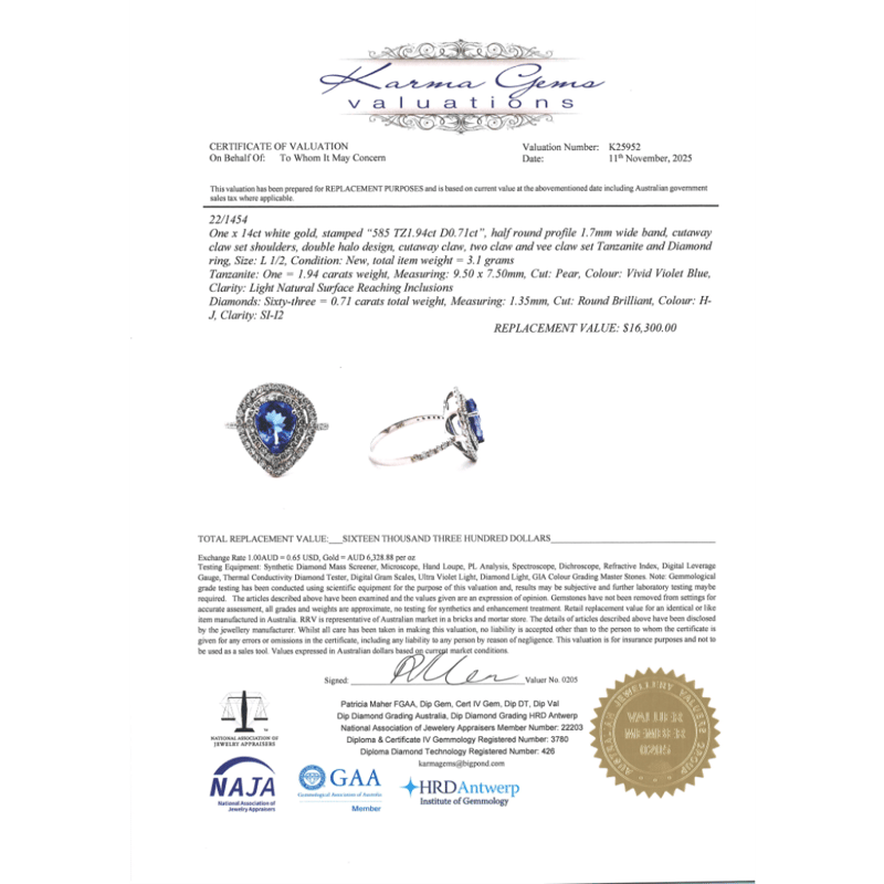 The Centre Features, One Pear Cut, Vivid Violet Blue, Tanzanite (1.94Ct, Light Natural Inclusions), Prong/Claw Set. Surrounding The Centre In A Double Halo And Decorating The Band Are, 63 Round Brilliant Cut, Diamonds (0.71Ct Tdw, H-J Colour, Si-I2 Clarity), Micro-Claw Set. Ring Size L 1/2.
