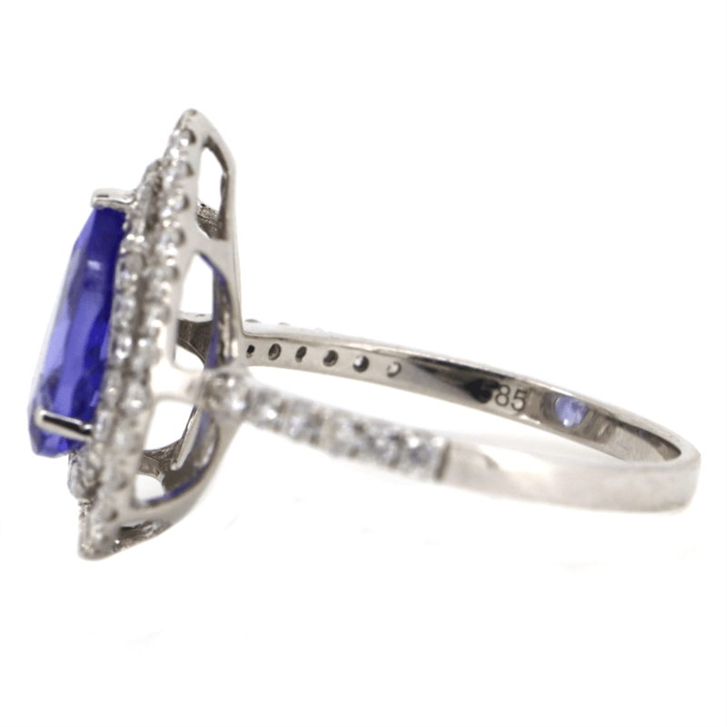 14K WHITE GOLD, TANZANITE AND DIAMOND, DOUBLE HALO RING.