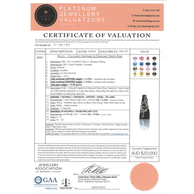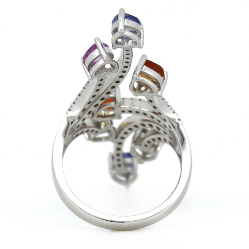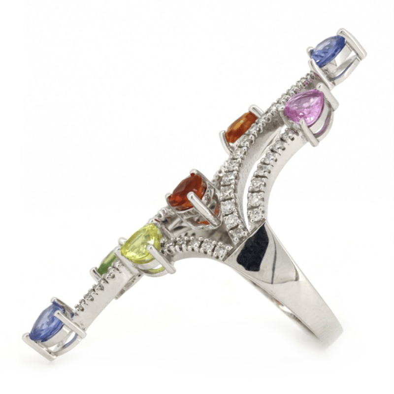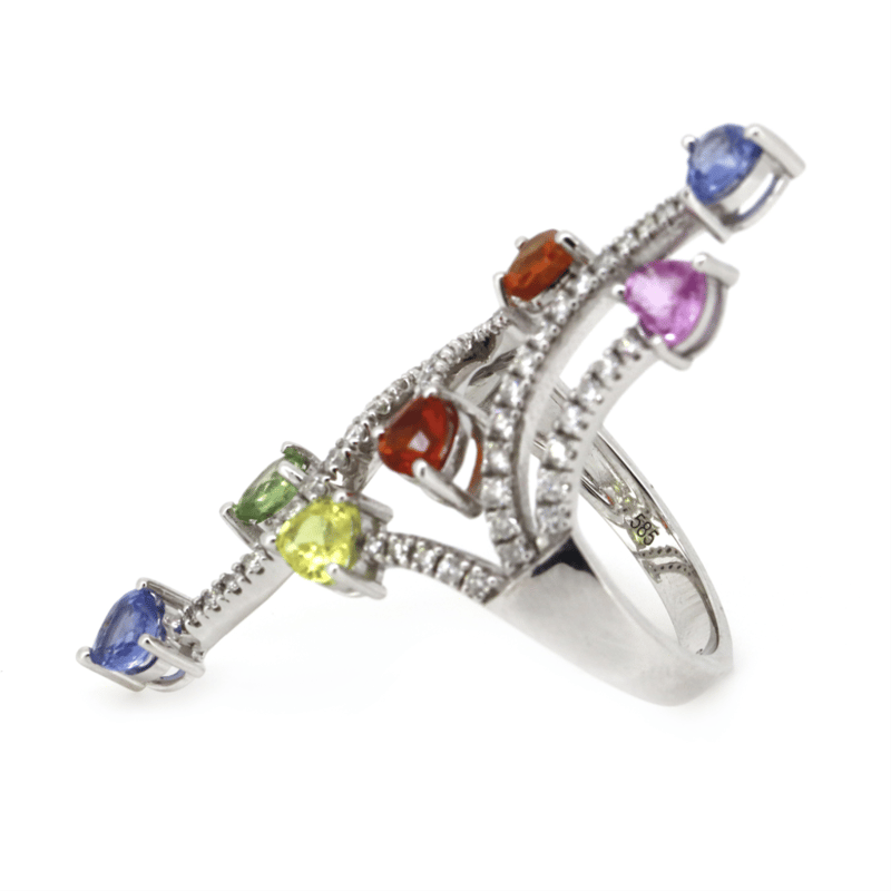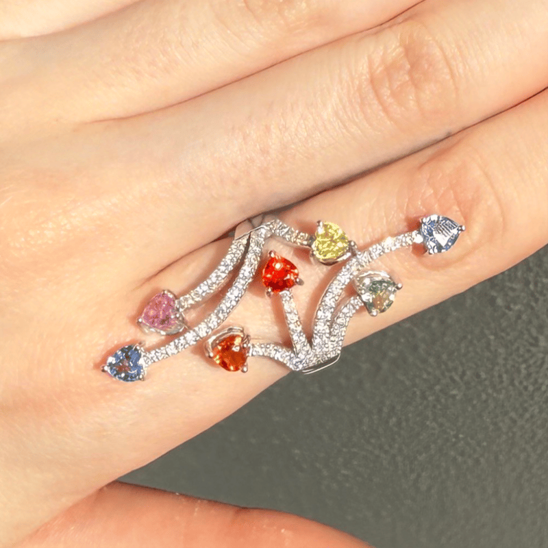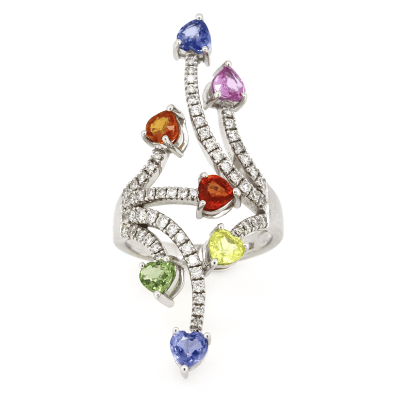 The Ring Features, 7 Heart Cut, Red, Orange, Yellow, Blue, Green And Lilac, Sapphires (2.25Ct Tsw, Heavily Included, Enhanced), Pip-Claw Set. Decorating The Piece Are, 60 Round Brilliant Cut, Diamonds (0.52Ct Tdw, G-H Colour, Si1-Si2 Clarity), Bead Set. Ring Size M.