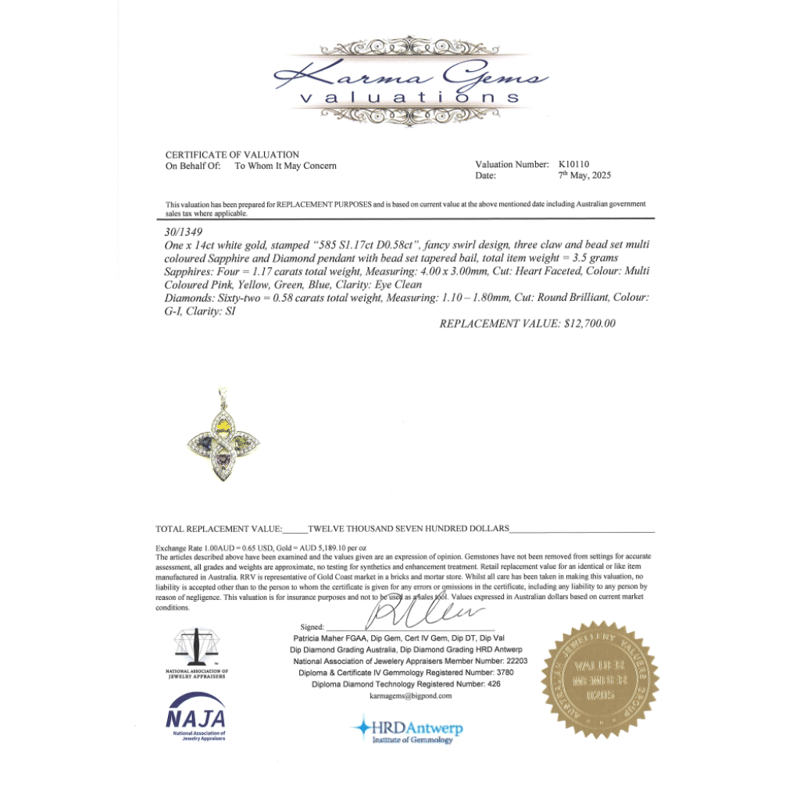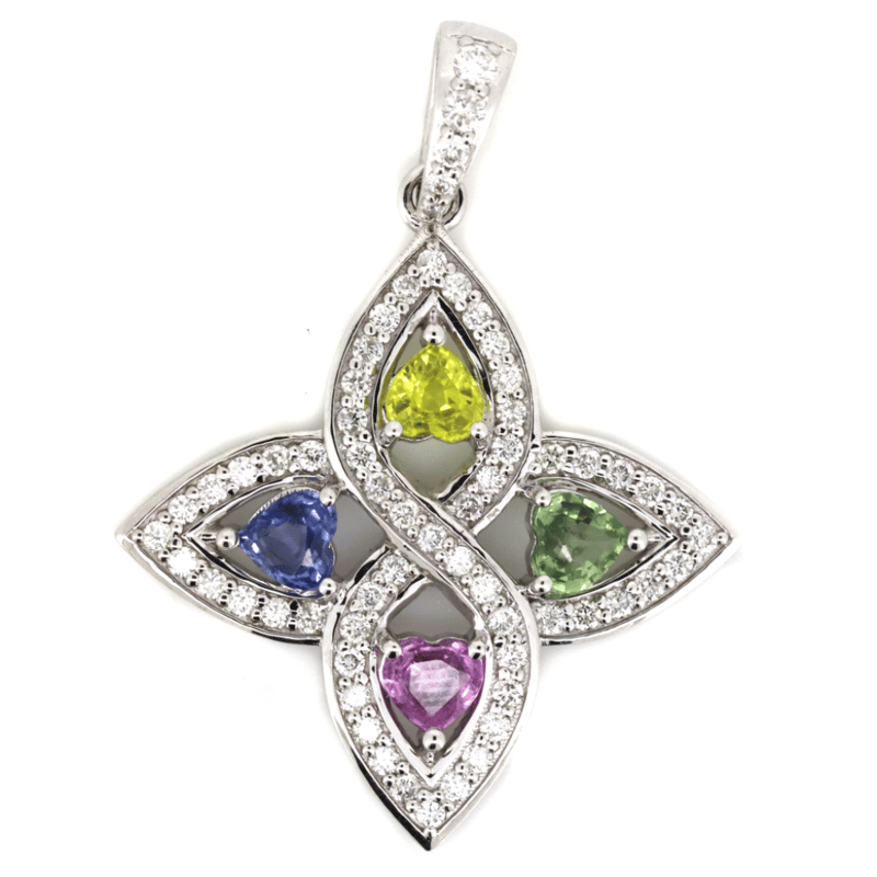 The Centre Features, 4 Heart Faceted Cut, Pink, Yellow, Green And Blue Sapphires (1.17Ct Tsw, Eye Clean Clarity), Claw Set. Encompassing The Centre Are, 62 Round Brilliant Cut, Diamonds (0.58Ct Tdw, G-I Colour, Si Clarity), Bead Set.