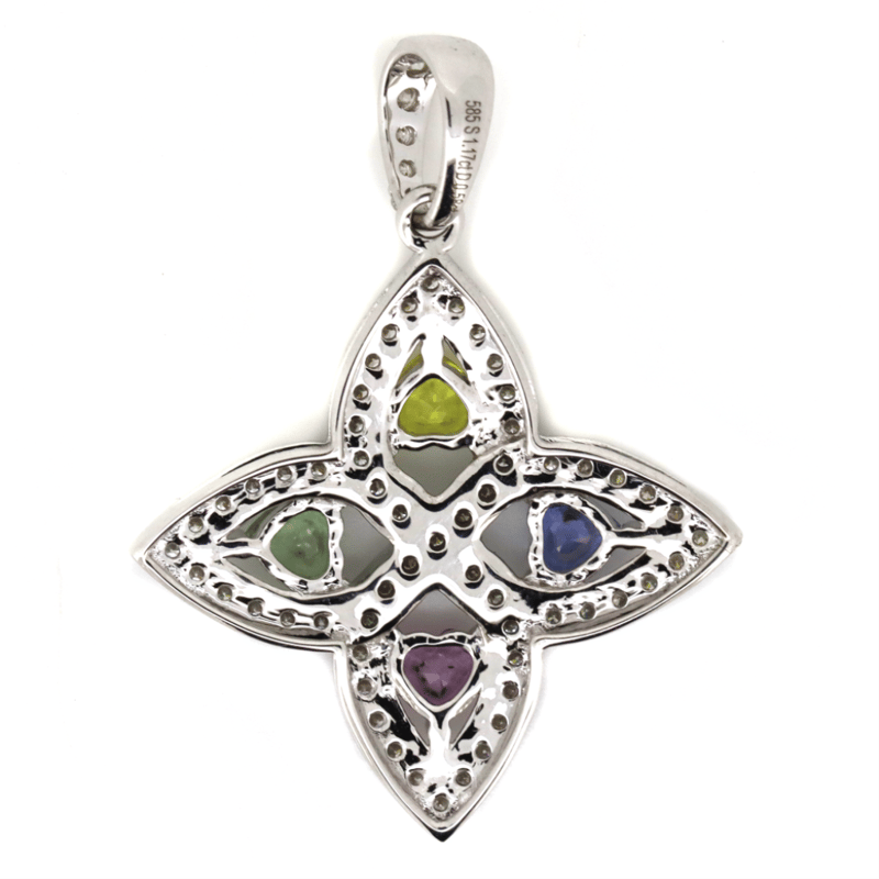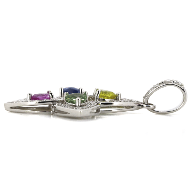14K WHITE GOLD, MULTI-COLOURED SAPPHIRE AND DIAMOND, PENDANT.