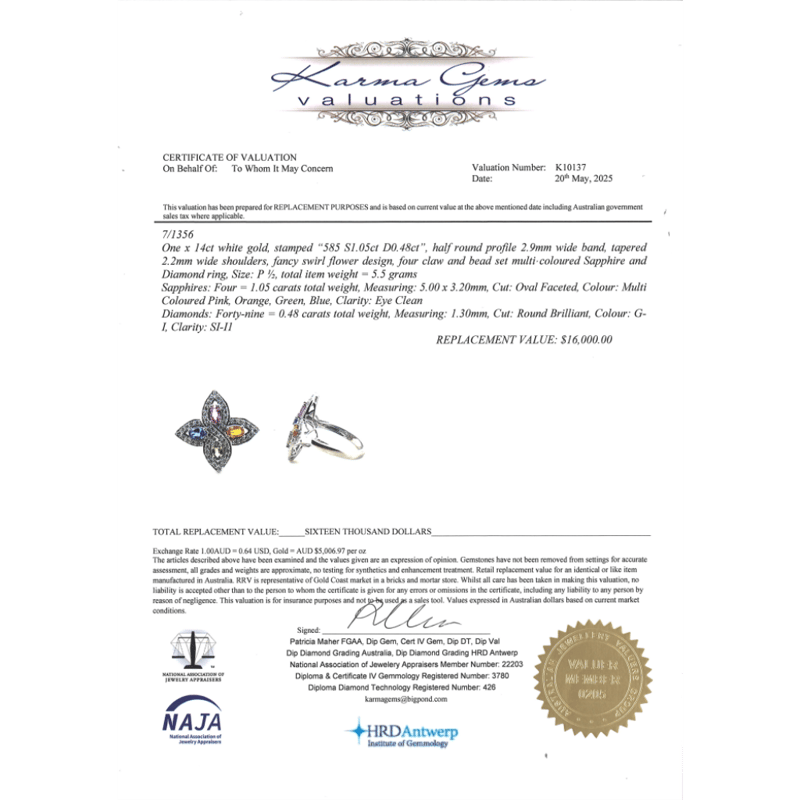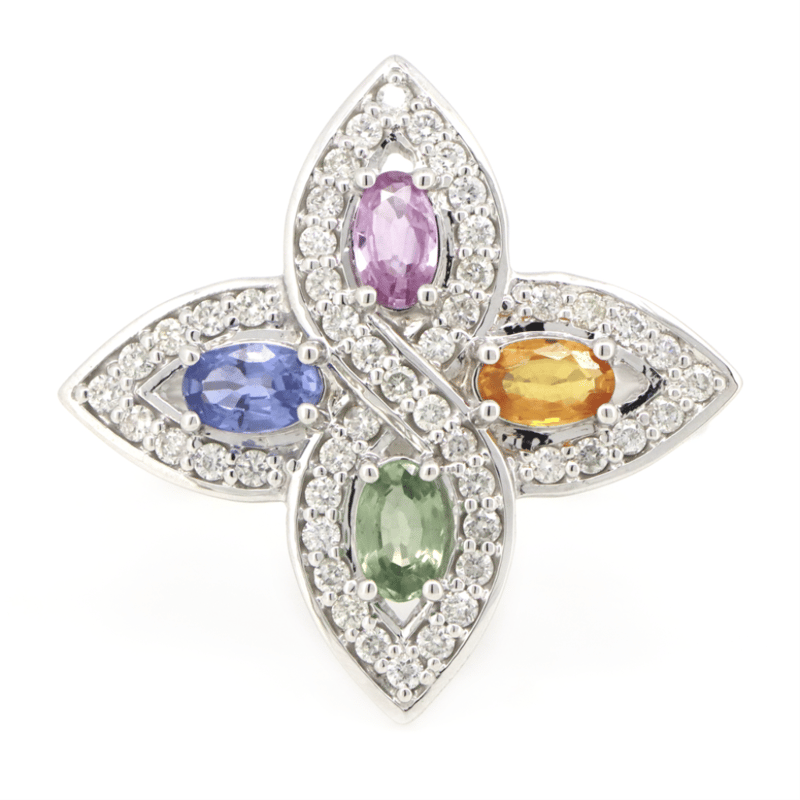The Design Features, 4 Oval Faceted Cut, Pink, Orange, Green And Blue, Sapphires (1.05Ct Tsw, Eye Clean Clarity), 4 Claw Set. Encompassing The Design Are, 49 Round Brilliant Cut, Diamonds (0.48Ct Tdw, G-I Colour, Si-I1 Clarity), Bead Set. Ring Size P 1/2.