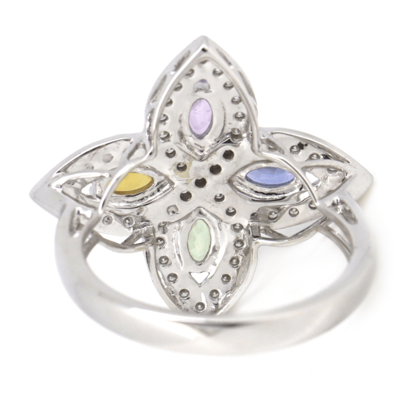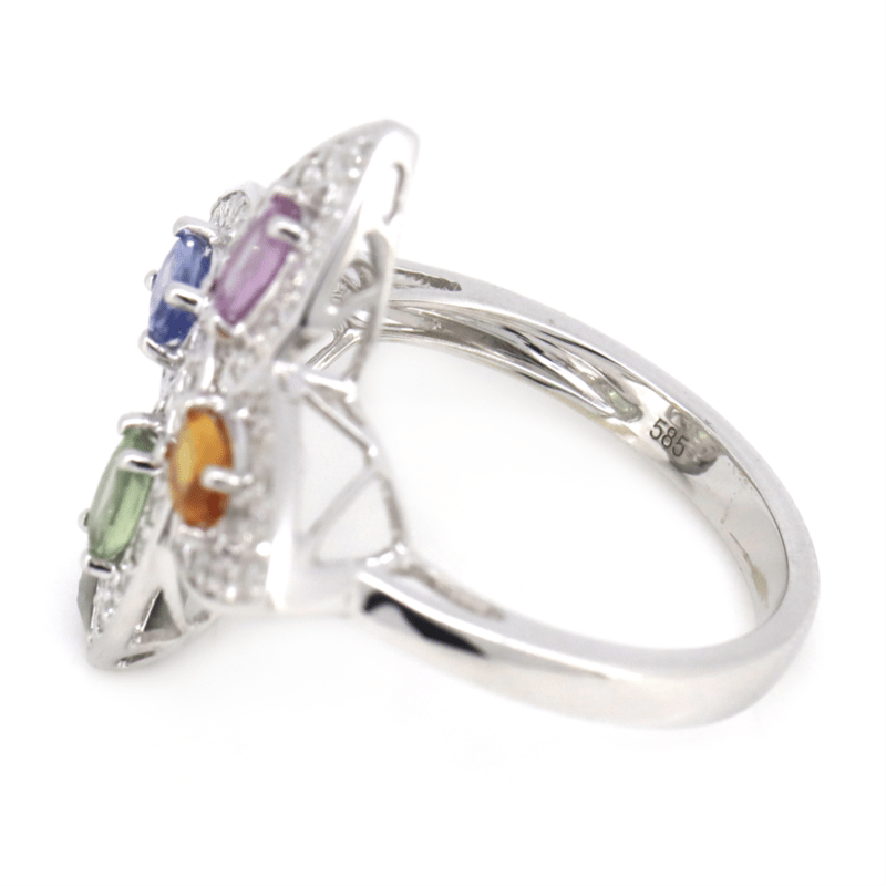 14K WHITE GOLD, MULTI-COLOURED SAPPHIRE AND DIAMOND, DRESS RING.