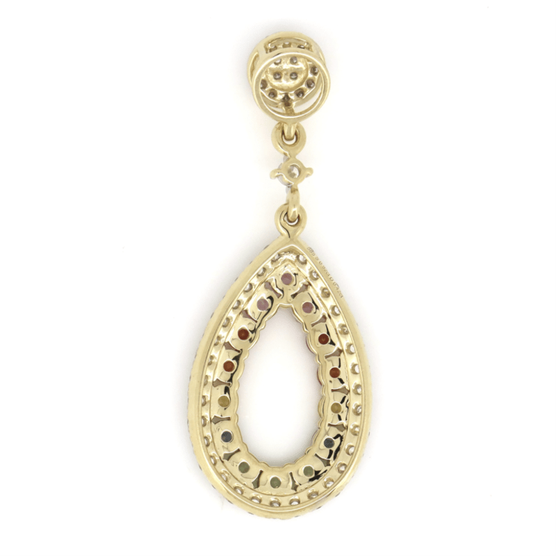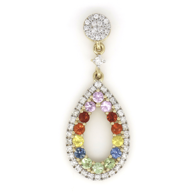The Design Features, 14 Round Faceted Cut, Pink, Green, Blue, Yellow, Orange And Red, Sapphires (0.92Ct Tsw, Eye Clean Clarity), 4 Claw Set. Surrounding The Sapphires In A Halo And Decorating The Drop Are, 49 Round Brilliant Cut, Diamonds (0.42Ct Tdw, G-I Colour, Si-I2 Clarity), Cutaway Claw/Bead Set.