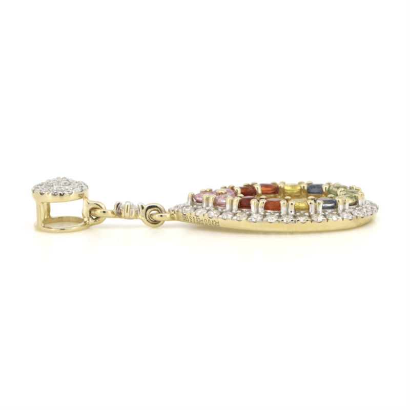 14K YELLOW GOLD, MULTI-COLOURED SAPPHIRE AND DIAMOND, DECORATIVE PENDANT.