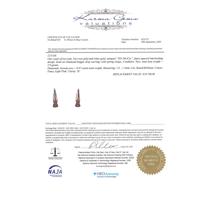 14K ROSE GOLD, FANCY PINK DIAMOND, HUGGIE DROP EARRINGS. The Designs Feature, 72 Round Brilliant Cut, Fancy Pink, Diamonds (0.67Ct Tdw, Si Clarity), Bead Set. The Earrings Feature Hinged Clip Huggies. Valuations Provided by an Independent Third-Party Professional Not Directly Associated With Lloyds Auctions at AUD $$18,700.00This valuation has been conducted by an independent third-party professional. The valuation amount is an assessment by the issuing valuer and does not reflect the auction value of the item. Any inquiries regarding the valuation should be directed to the issuing valuer (refer to contact details on the certificate), as Lloyds Auctions has no affiliation or influence over the valuation, the valuer, or the stated amount. Condition: Good - Refer Images 0645967+36