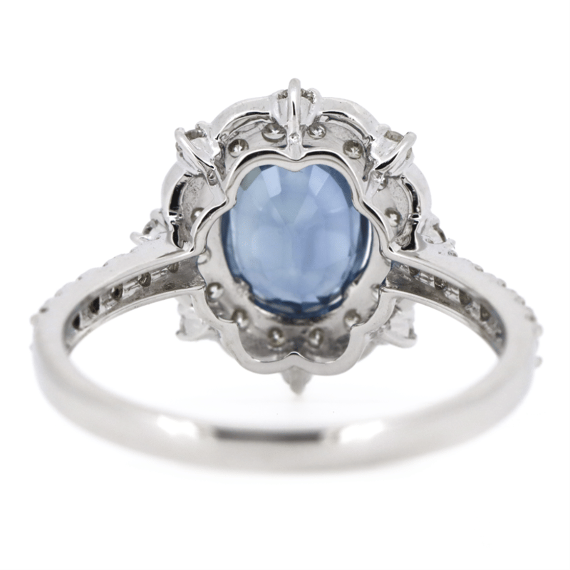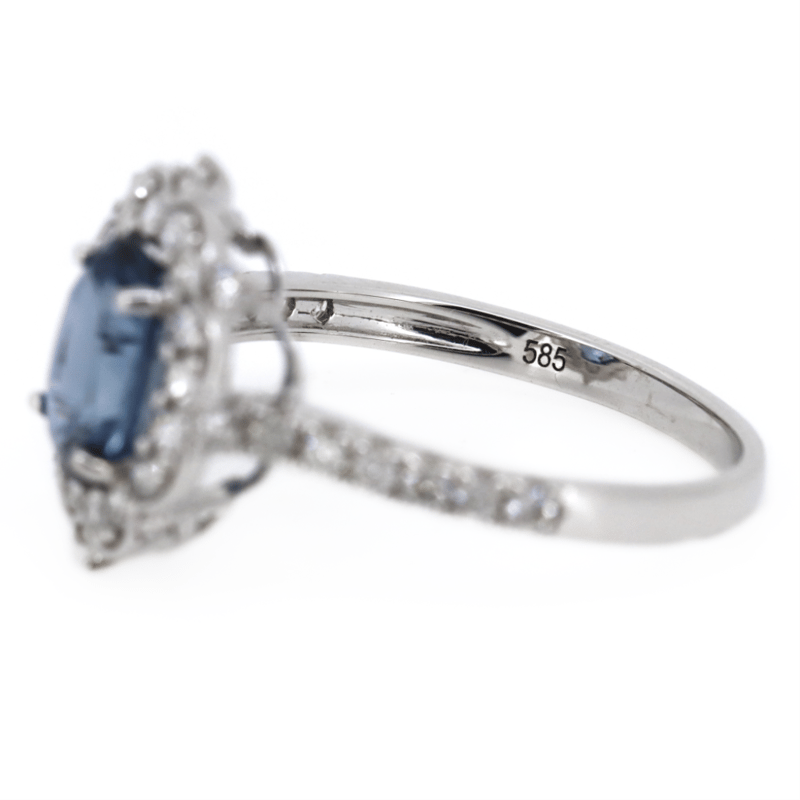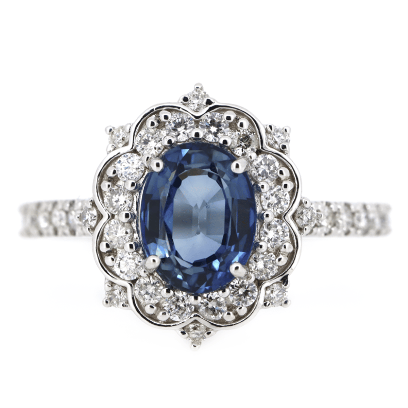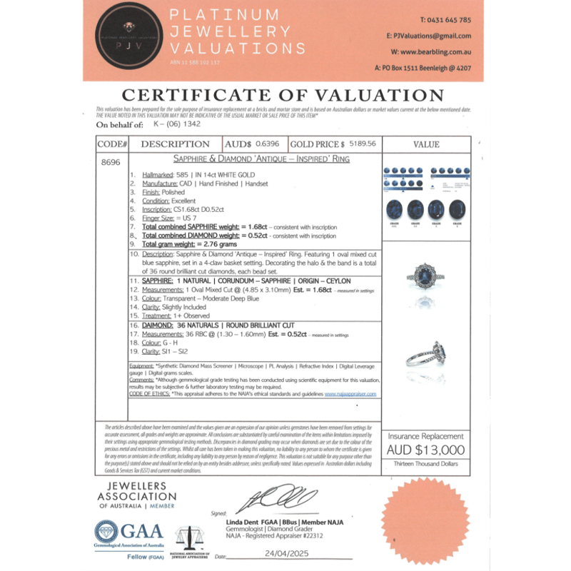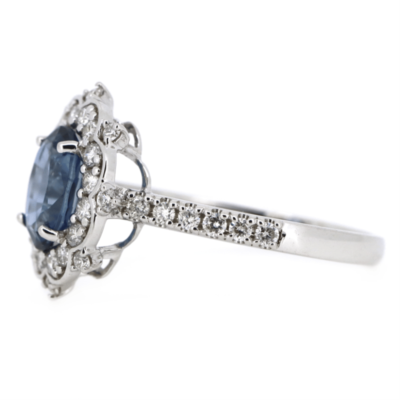 The Centre Features, One Oval Cut, Deep-Blue, Ceylon Sapphire (1.68Ct, Slightly-Included), Claw Set. Decorating The Halo And The Band Are 36 Round Brilliant Cut, Diamonds (0.52Ct Tdw, G-H Colour, Si1-Si2-Clarity), Bead Set. Ring Size N 1/2.