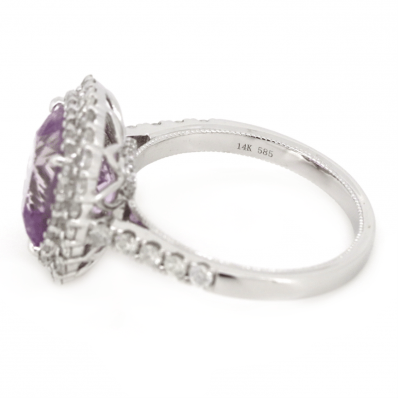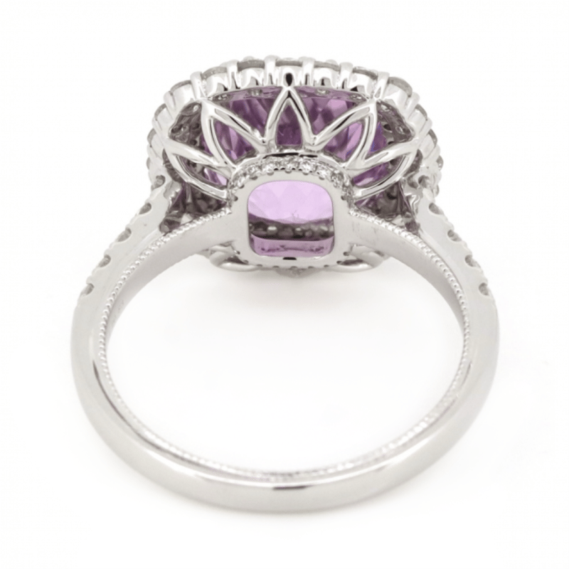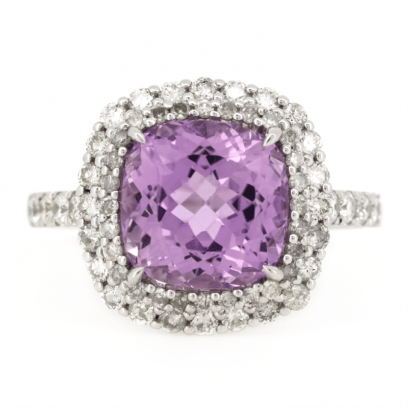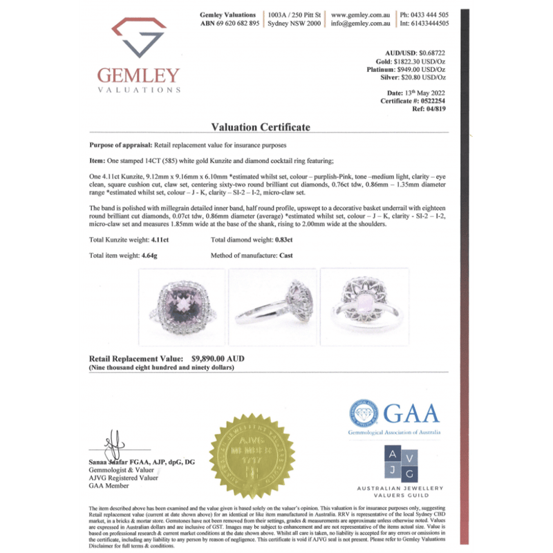 14K WHITE GOLD, KUNZITE AND DIAMOND, DOUBLE HALO RING. The Centre Features, One Square Cushion Cut, Medium Light Purplish-Pink, Kunzite (4.11Ct, Eye Clean Clarity), Claw Set. Surrounding The Centre In A Double Halo And Decorating The Band/Basket Are, 80 Round Brilliant Cut, Diamonds (0.83Ct Tdw, J-K Colour, Si2-I2 Clarity), Micro-Claw Set. Ring Size M. Valuations Provided by an Independent Third-Party Professional Not Directly Associated With Lloyds Auctions at AUD $$9,890.00This valuation has been conducted by an independent third-party professional. The valuation amount is an assessment by the issuing valuer and does not reflect the auction value of the item. Any inquiries regarding the valuation should be directed to the issuing valuer (refer to contact details on the certificate), as Lloyds Auctions has no affiliation or influence over the valuation, the valuer, or the stated amount. Condition: Good - Refer Images 0645967+41