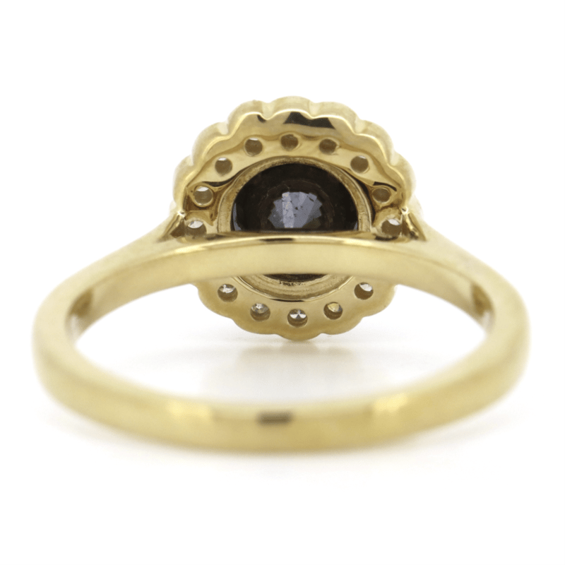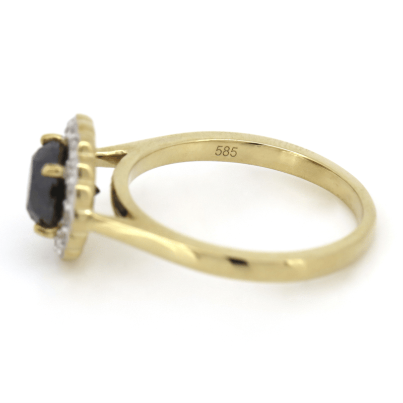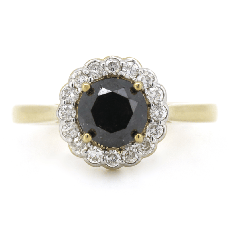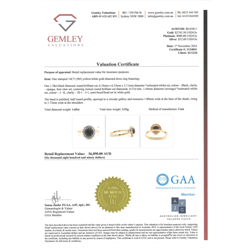 14K YELLOW/WHITE GOLD, BLACK DIAMOND AND DIAMOND, HALO RING. The Centre Features, One Round Brilliant Cut, Black, Diamond (1.38Ct, Opaque), 4 Claw Set. Surrounding The Centre In A Halo Are, 16 Round Brilliant Cut, Diamonds (0.27Ct Tdw, J-K Colour, Si1-I1 Clarity), Semi Bezel/Bead Set In White Gold. Ring Size M. Valuations Provided by an Independent Third-Party Professional Not Directly Associated With Lloyds Auctions at AUD $$6,890.00This valuation has been conducted by an independent third-party professional. The valuation amount is an assessment by the issuing valuer and does not reflect the auction value of the item. Any inquiries regarding the valuation should be directed to the issuing valuer (refer to contact details on the certificate), as Lloyds Auctions has no affiliation or influence over the valuation, the valuer, or the stated amount. Condition: Good - Refer Images 0645967+48