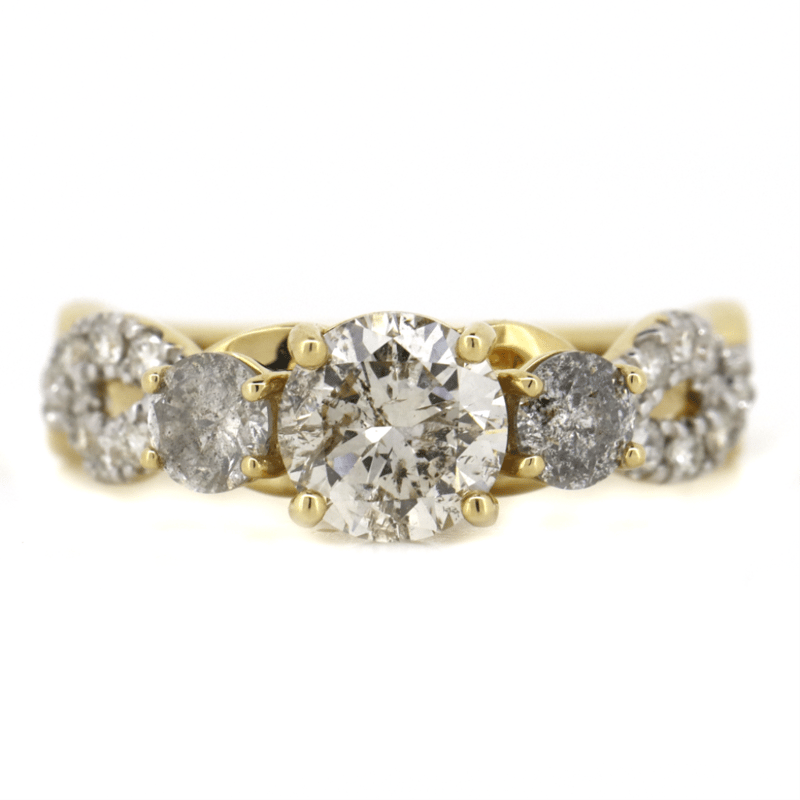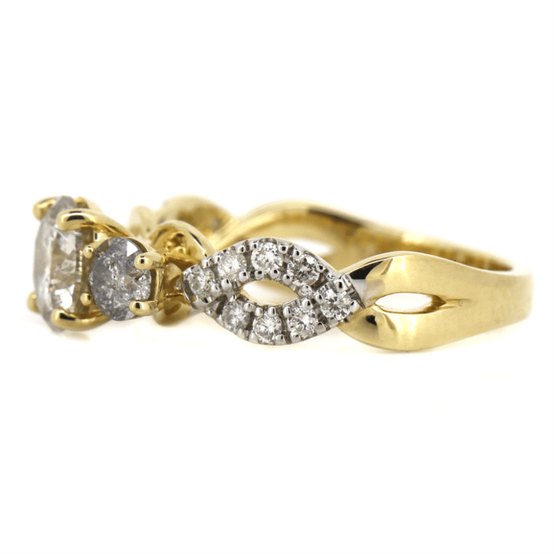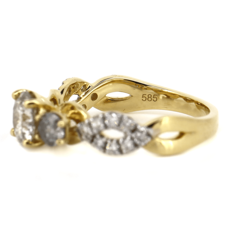 14K YELLOW GOLD AND DIAMOND, TRILOGY TWIST BAND RING. The Centre Features, One Round Brilliant Cut, Diamond (1.05Ct, H-I Colour, I2 Clarity), Claw Set. Flanking The Centre Are, 2 Round Brilliant Cut, Diamonds (0.43Ct Tdw, H-J Colour, I3 Clarity), Claw Set. Decorating The Twist Band Are, 16 Round Brilliant Cut, Diamonds (0.23Ct Tdw, H-J Colour, Si-I1 Clarity), Bead Set. Ring Size M 1/2. Valuations Provided by an Independent Third-Party Professional Not Directly Associated With Lloyds Auctions at AUD $$28,800.00This valuation has been conducted by an independent third-party professional. The valuation amount is an assessment by the issuing valuer and does not reflect the auction value of the item. Any inquiries regarding the valuation should be directed to the issuing valuer (refer to contact details on the certificate), as Lloyds Auctions has no affiliation or influence over the valuation, the valuer, or the stated amount. Condition: Good - Refer Images 0645967+51