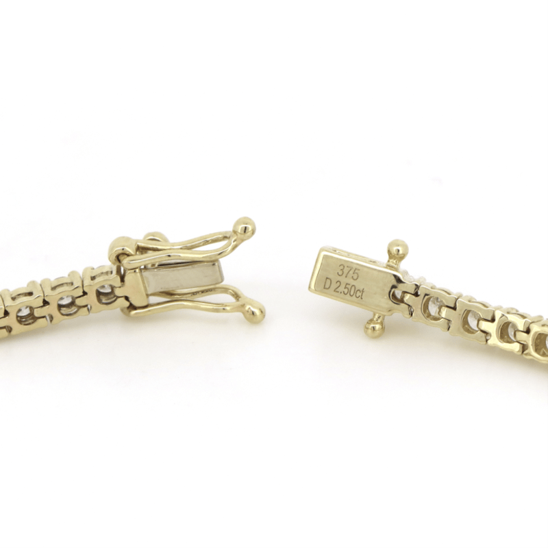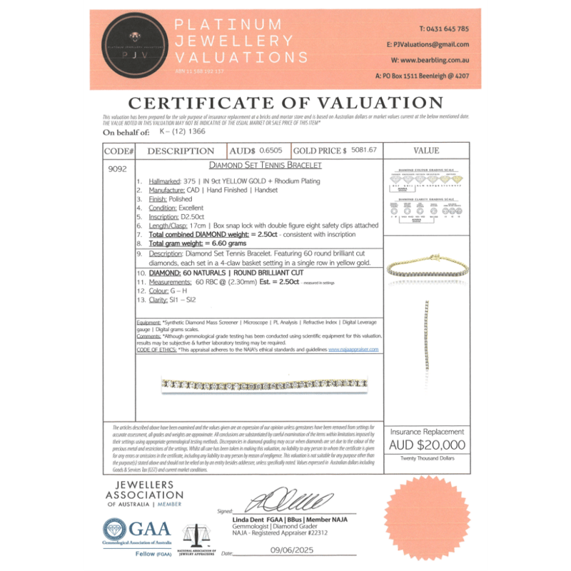 9K YELLOW GOLD, 2.50CT TDW DIAMOND, TENNIS BRACELET. The Design Features, 60 Round Brilliant Cut, Diamonds (2.50Ct Tdw, G-H Colour, Si1-Si2 Clarity), 4 Claw Set In A Single Row. The Bracelet Has A Box Lock With 2 'Figure 8' Safety Catches. Bracelet Length Is 17.0Cm. Valuations Provided by an Independent Third-Party Professional Not Directly Associated With Lloyds Auctions at AUD $$20,000.00This valuation has been conducted by an independent third-party professional. The valuation amount is an assessment by the issuing valuer and does not reflect the auction value of the item. Any inquiries regarding the valuation should be directed to the issuing valuer (refer to contact details on the certificate), as Lloyds Auctions has no affiliation or influence over the valuation, the valuer, or the stated amount. Condition: Good - Refer Images 0645967+52