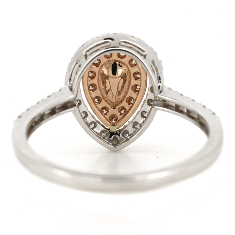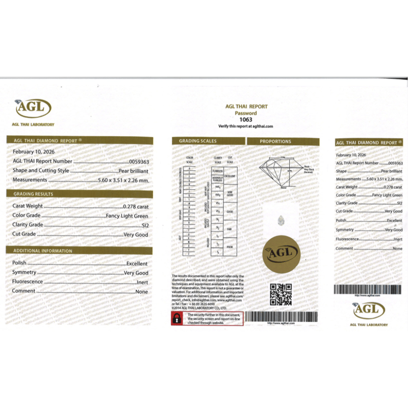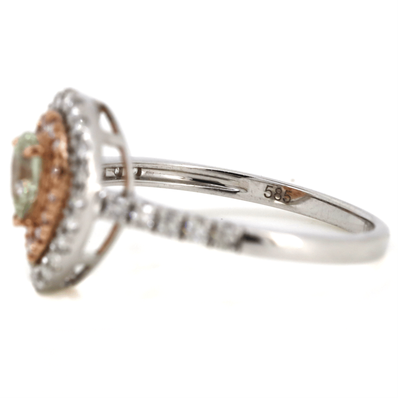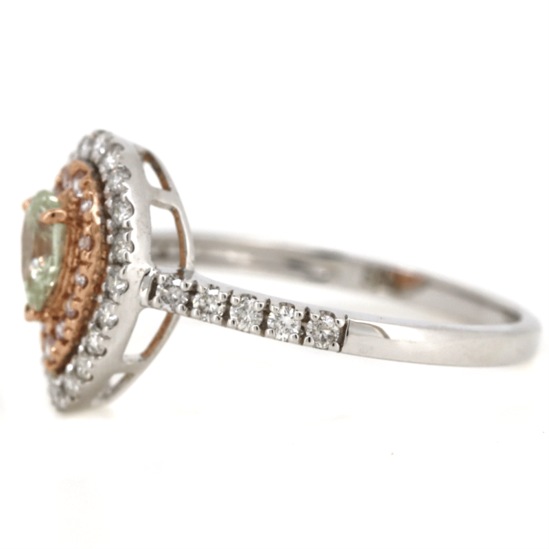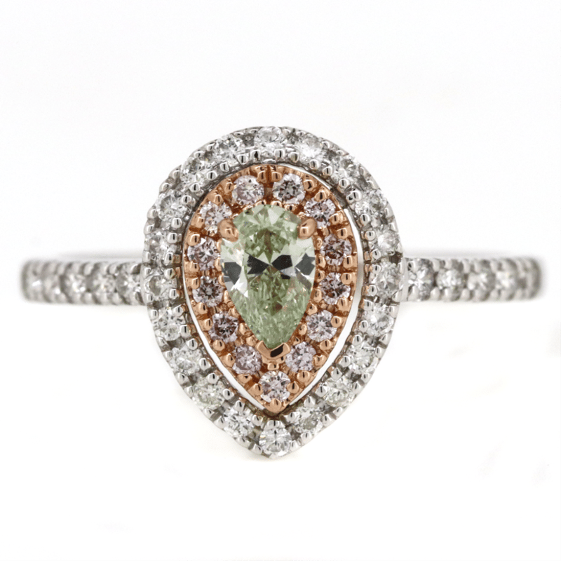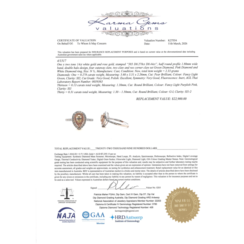 14K WHITE/ROSE GOLD, GREEN DIAMOND, DIAMOND AND PINK DIAMOND, DOUBLE HALO RING. The Centre Features, One Pear Brilliant Cut, Green Diamond (0.278Ct, Si2 Clarity, Agl Cert: 0059363), 3-Claw Set. Surrounding The Centre In The Inner Halo Are, 13 Round Brilliant Cut, Fancy Light Pink Diamonds (0.13Ct Tdw, Si1 Clarity), Bead Set. Surrounding The Centre In The Outer Halo And Decorating The Band Are, 30 Round Brilliant Cut, Diamonds (0.31Ct Tdw, G-I Colour, Si1-2 Clarity), Bead Set. Ring Size N 1/2. Valuations Provided by an Independent Third-Party Professional Not Directly Associated With Lloyds Auctions at AUD $$22,900.00This valuation has been conducted by an independent third-party professional. The valuation amount is an assessment by the issuing valuer and does not reflect the auction value of the item. Any inquiries regarding the valuation should be directed to the issuing valuer (refer to contact details on the certificate), as Lloyds Auctions has no affiliation or influence over the valuation, the valuer, or the stated amount. Condition: Good - Refer Images 0645967+61