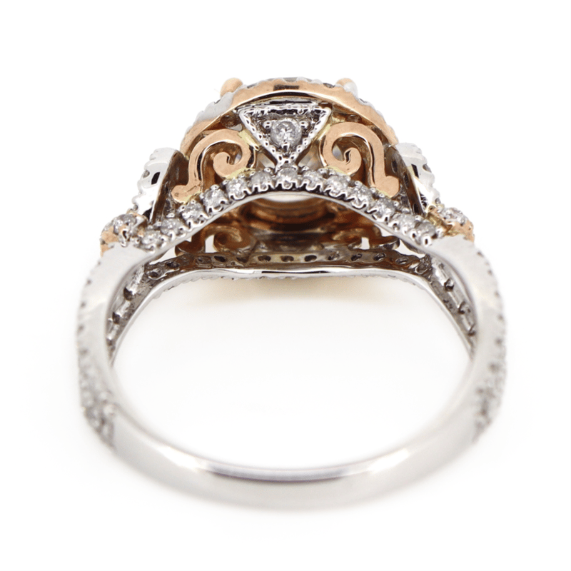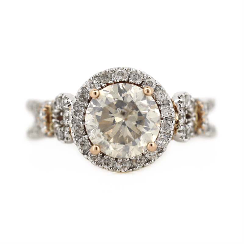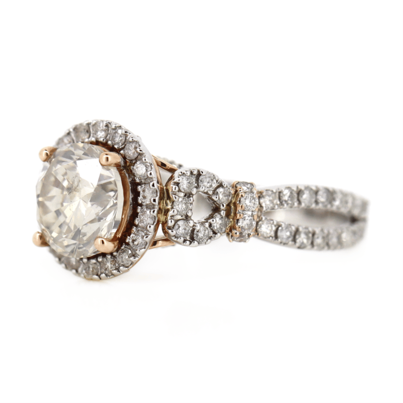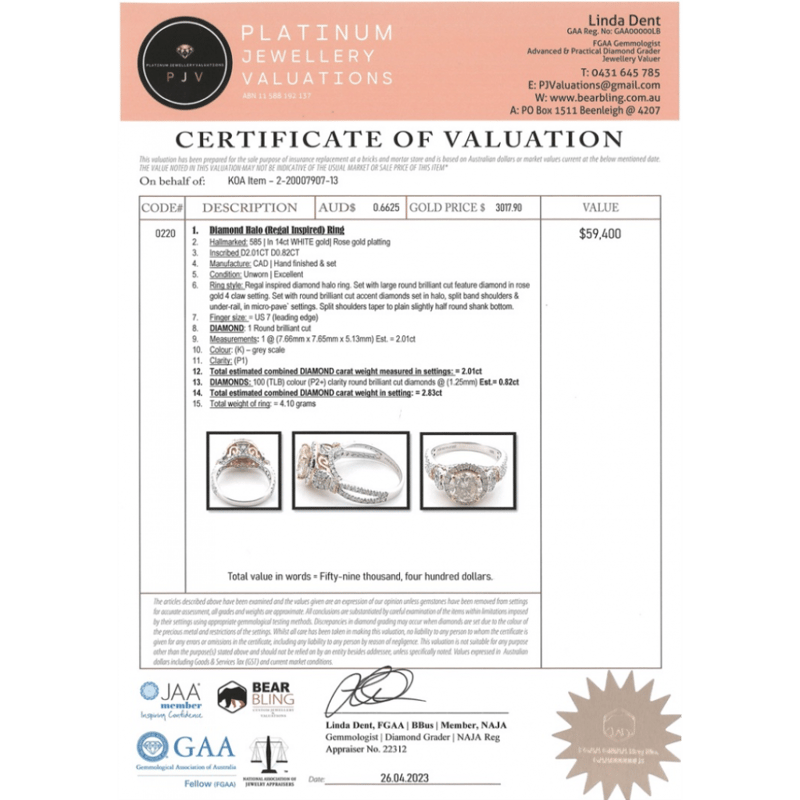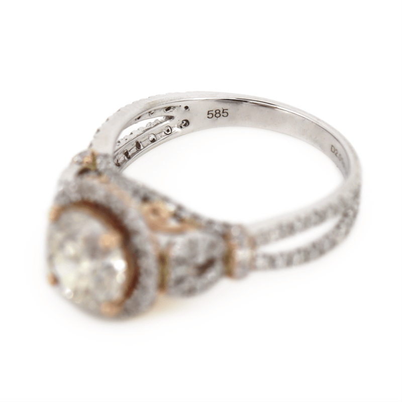 The Centre Features, One Round Brilliant Cut, Diamond (2.01Ct, K Colour, P1 Clarity), Claw Set In Rose Gold. Surrounding The Centre In A Halo And Decorating The Shoulders Along The Band Are, 100 Round Brilliant Cut, Diamonds (0.82Ct Tdw, Tlb Colour, P2+ Clarity), Micro-Pave Set In White Gold. The Centre Setting Has Been 14K Rose Gold Plated To Achieve A Two-Tone Effect. Ring Size N.