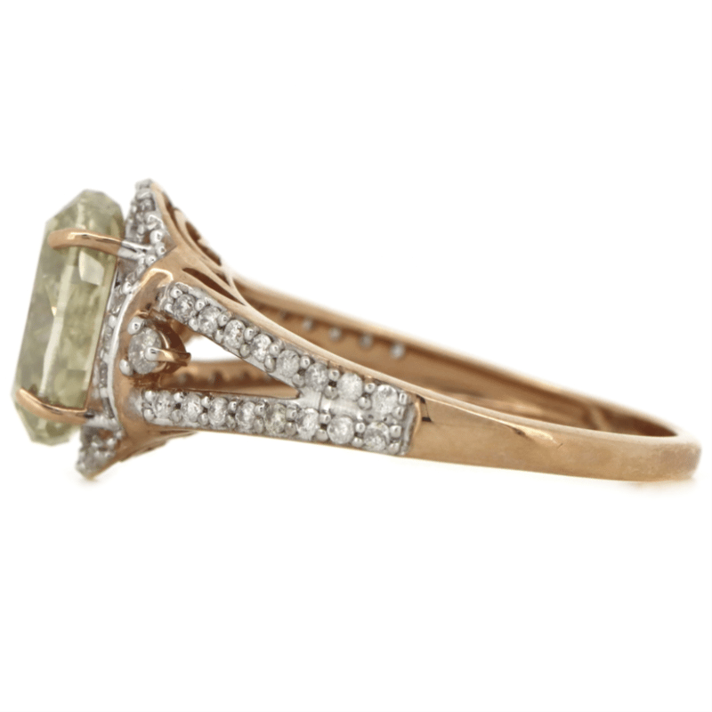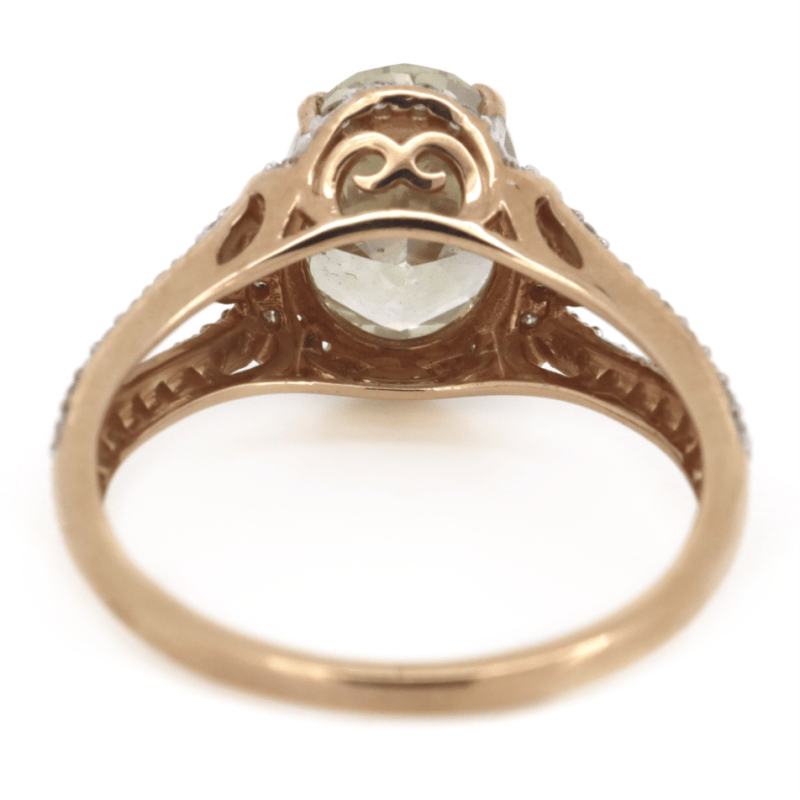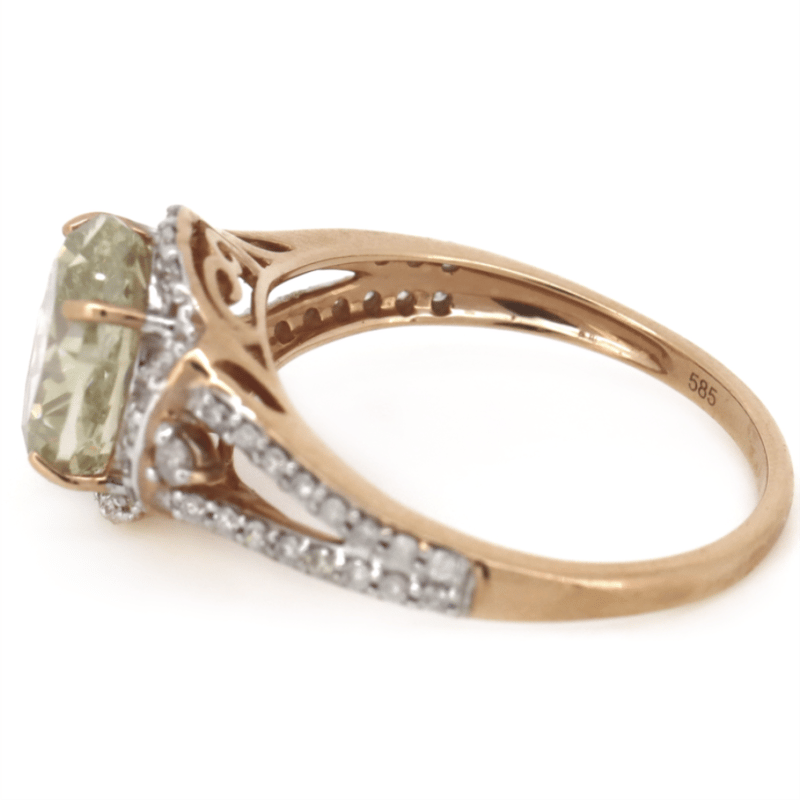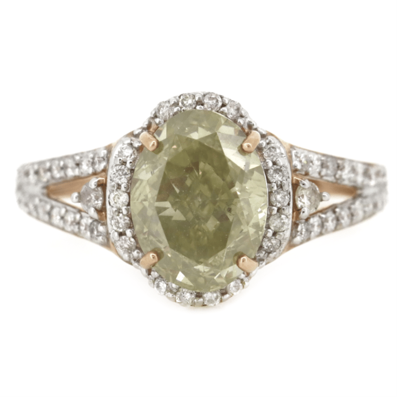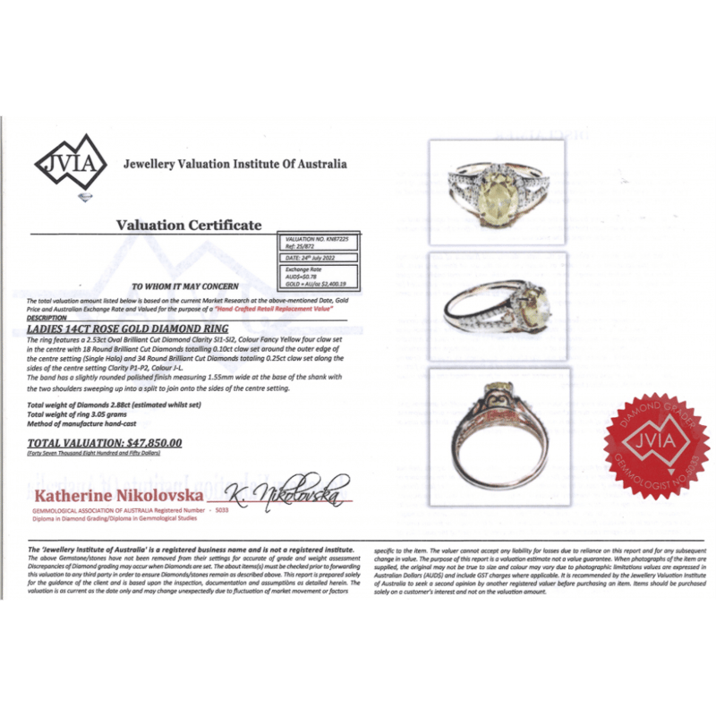 14K ROSE GOLD, FANCY YELLOW DIAMOND AND DIAMOND, HALO SPLIT BAND RING. The Centre Features, One Oval Brilliant Cut, Fancy Yellow, Diamond (2.53Ct, Si1-Si2 Clarity), Claw Set. Surrounding The Centre In A Halo And Decorating The Split Band Are, 52 Round Brilliant Cut, Diamonds (0.35Ct Tdw, J-L Colour, P1-P2 Clarity), Claw Set. Ring Size N. Valuations Provided by an Independent Third-Party Professional Not Directly Associated With Lloyds Auctions at AUD $$47,850.00This valuation has been conducted by an independent third-party professional. The valuation amount is an assessment by the issuing valuer and does not reflect the auction value of the item. Any inquiries regarding the valuation should be directed to the issuing valuer (refer to contact details on the certificate), as Lloyds Auctions has no affiliation or influence over the valuation, the valuer, or the stated amount. Condition: Good - Refer Images 0645967+66