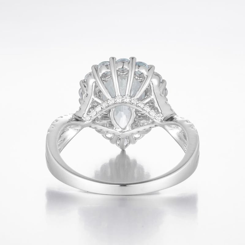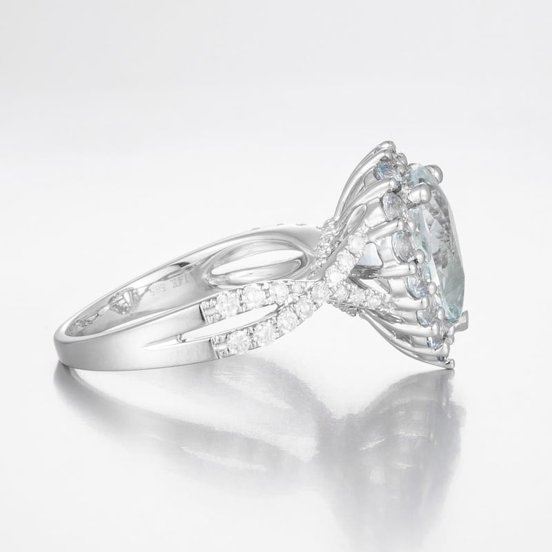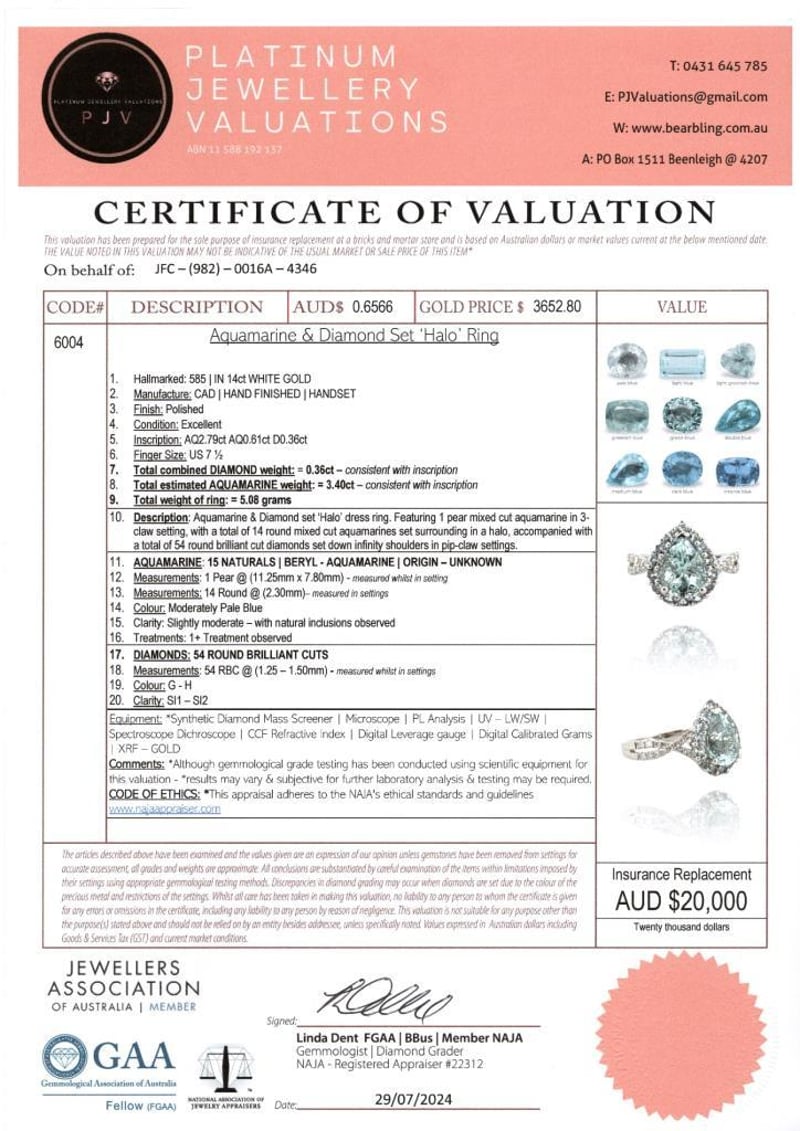 14CT WHITE GOLD AQUAMARINE AND DIAMOND STATEMENT RING Featuring Centre, One Pear And 14 Round Cut, Moderately Pale Blue Aquamarines (3.40Ct Tsw, Slightly Moderate), Claw/Bead Set, With 54 Round Brilliant Cut Diamonds (0.36Ct Tdw, G-H Colour, Si1-Si2 Clarity), Pip Claw Set. Ring Size O. Valuations Provided by an Independent Third-Party Professional Not Directly Associated With Lloyds Auctions at AUD $20000This valuation has been conducted by an independent third-party professional. The valuation amount is an assessment by the issuing valuer and does not reflect the auction value of the item. Any inquiries regarding the valuation should be directed to the issuing valuer (refer to contact details on the certificate), as Lloyds Auctions has no affiliation or influence over the valuation, the valuer, or the stated amount. Condition: Good - Refer Images 0584524+2137