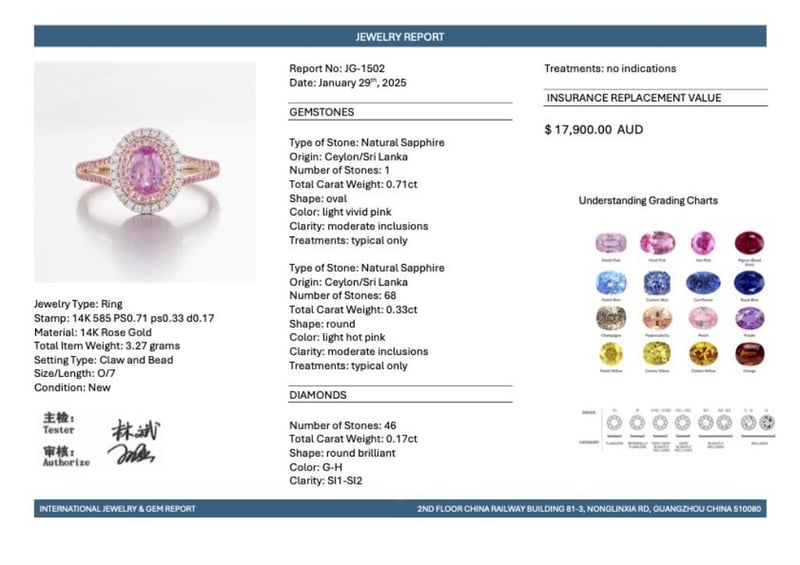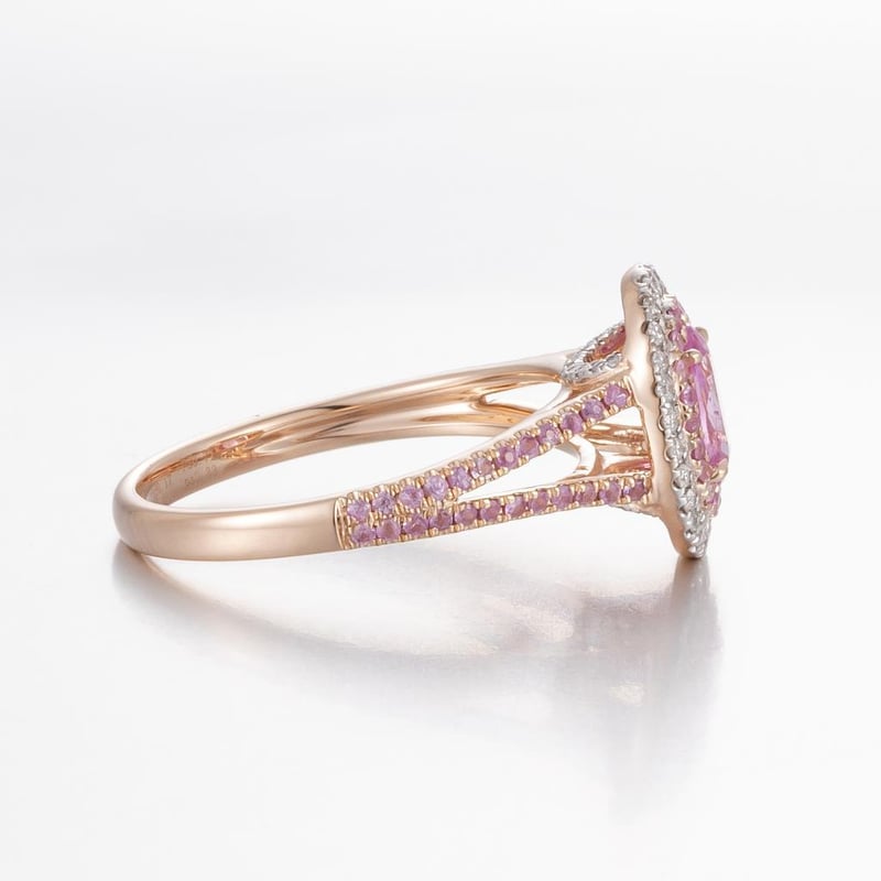 14CT ROSE GOLD PINK CEYLON SAPPHIRE AND DIAMOND DOUBLE HALO RING Featuring Centre, One Oval Cut, Light Vivid Pink Ceylon Sapphire (0.71Ct Tsw, Moderate Inclusions), Claw Set, With 68 Round Cut, Light Hot Pink Ceylon Sapphires (0.33Ct Tsw, Moderate Inclusions), Bead Set, And 46 Round Brilliant Cut Diamonds (0.17Ct Tdw, G-H Colour, Si1-Si2 Clarity), Bead Set. Ring Size O. Valuations Provided by an Independent Third-Party Professional Not Directly Associated With Lloyds Auctions at AUD $17900This valuation has been conducted by an independent third-party professional. The valuation amount is an assessment by the issuing valuer and does not reflect the auction value of the item. Any inquiries regarding the valuation should be directed to the issuing valuer (refer to contact details on the certificate), as Lloyds Auctions has no affiliation or influence over the valuation, the valuer, or the stated amount. Condition: Good - Refer Images 0584524+2140