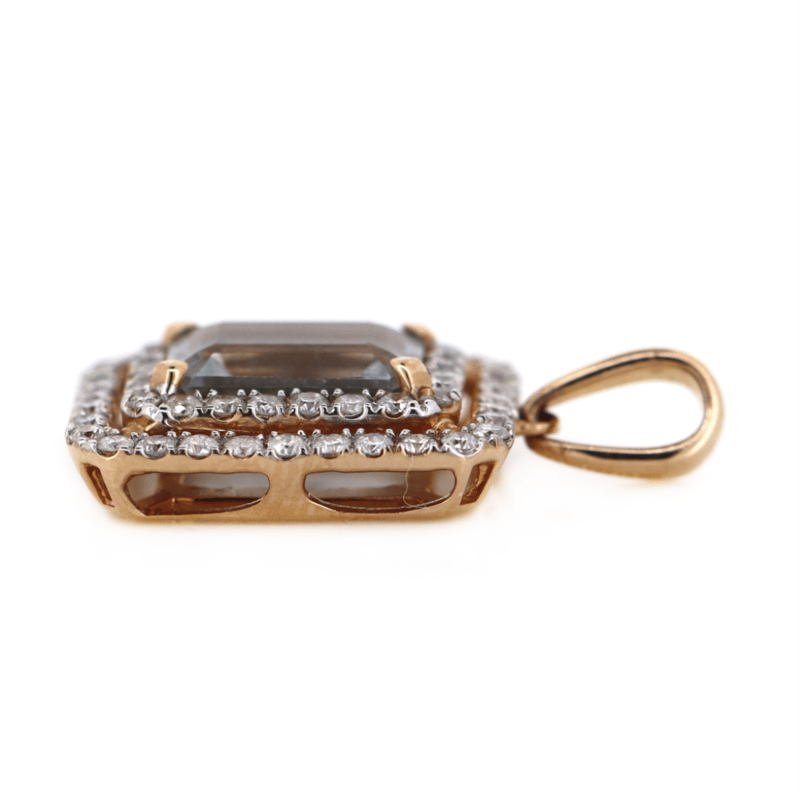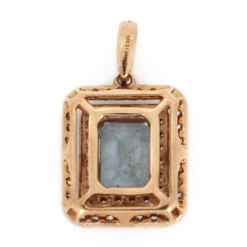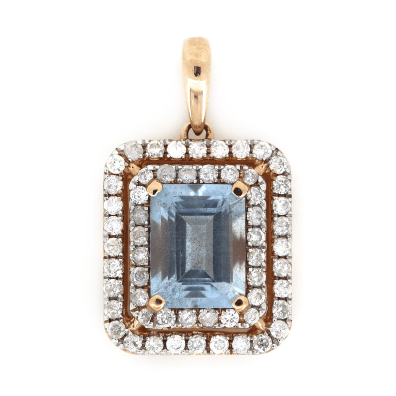 14K ROSE GOLD, AQUAMARINE AND DIAMOND, DOUBLE HALO PENDANT.