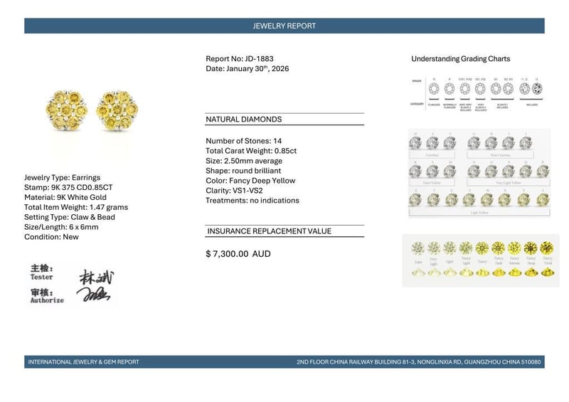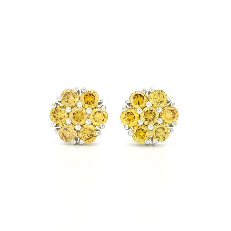 9CT WHITE GOLD FANCY DEEP YELLOW DIAMOND FLORAL STUD EARRINGS Featuring, 14 Round Brilliant Cut, Fancy Deep Yellow Diamonds (0.85Ct Tdw, Vs1-Vs2 Clarity), Claw Set. Valuations Provided by an Independent Third-Party Professional Not Directly Associated With Lloyds Auctions at AUD $7300This valuation has been conducted by an independent third-party professional. The valuation amount is an assessment by the issuing valuer and does not reflect the auction value of the item. Any inquiries regarding the valuation should be directed to the issuing valuer (refer to contact details on the certificate), as Lloyds Auctions has no affiliation or influence over the valuation, the valuer, or the stated amount. Condition: Good - Refer Images 0584528+2176