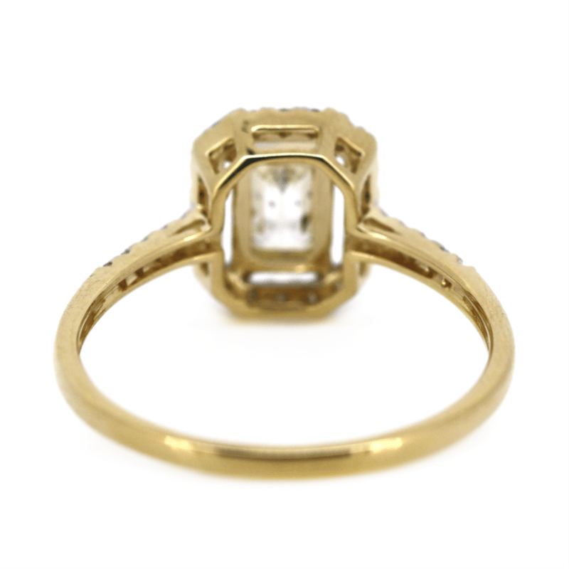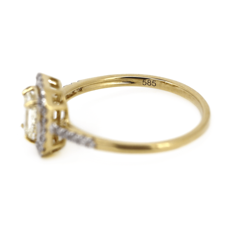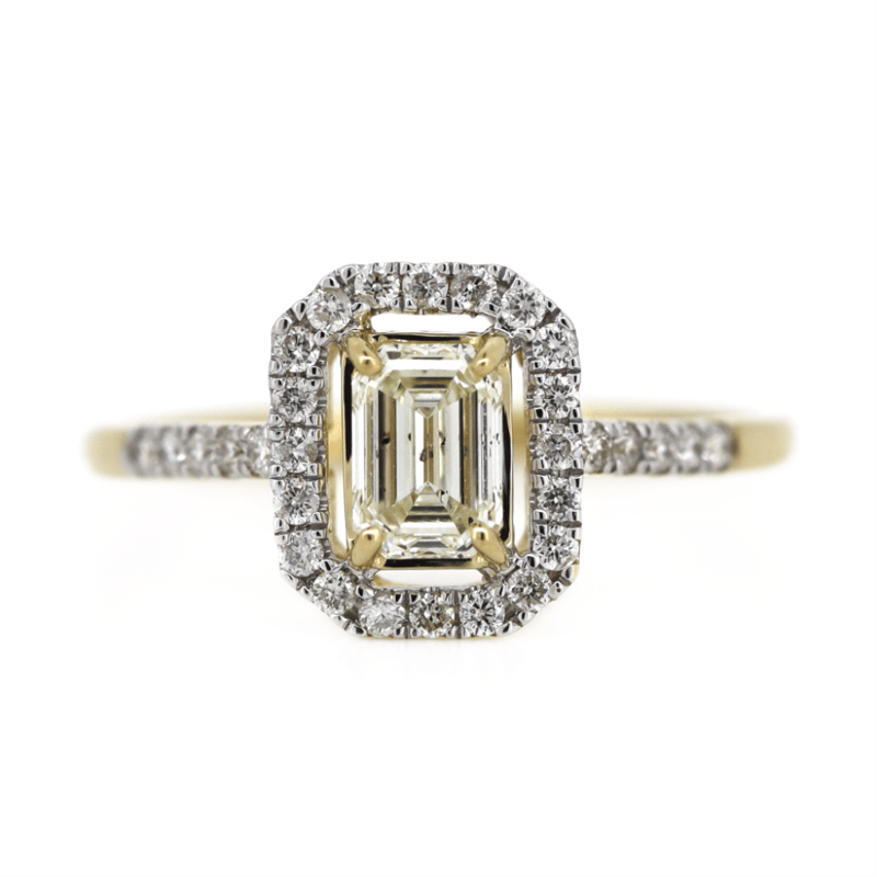 14K YELLOW GOLD AND DIAMOND, HALO RING. The Centre Features, One Emerald Cut Fancy Light Yellow, Diamond (0.50Ct, Si2 Clarity), 4 Claw Set. Surrounding The Centre In A Halo And Decorating The Band Are, 30 Round Brilliant Cut, Diamonds (0.21Ct Tdw, G-J Colour, Si-I2 Clarity), Bead Set With Rhodium Plating. Ring Size M 1/2. Valuations Provided by an Independent Third-Party Professional Not Directly Associated With Lloyds Auctions at AUD $$14,300.00This valuation has been conducted by an independent third-party professional. The valuation amount is an assessment by the issuing valuer and does not reflect the auction value of the item. Any inquiries regarding the valuation should be directed to the issuing valuer (refer to contact details on the certificate), as Lloyds Auctions has no affiliation or influence over the valuation, the valuer, or the stated amount. Condition: Good - Refer Images 0645975+6