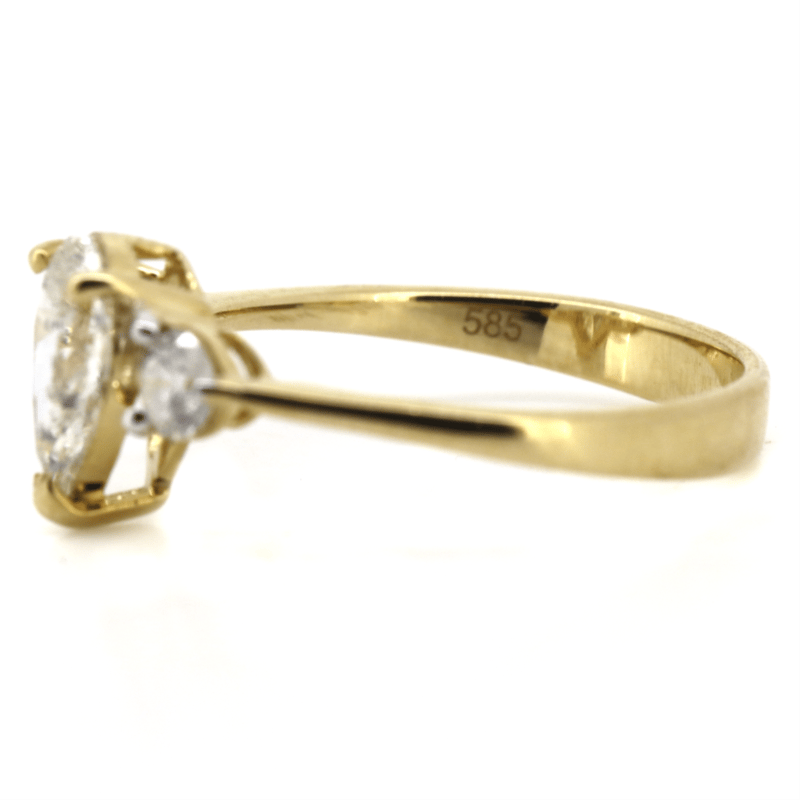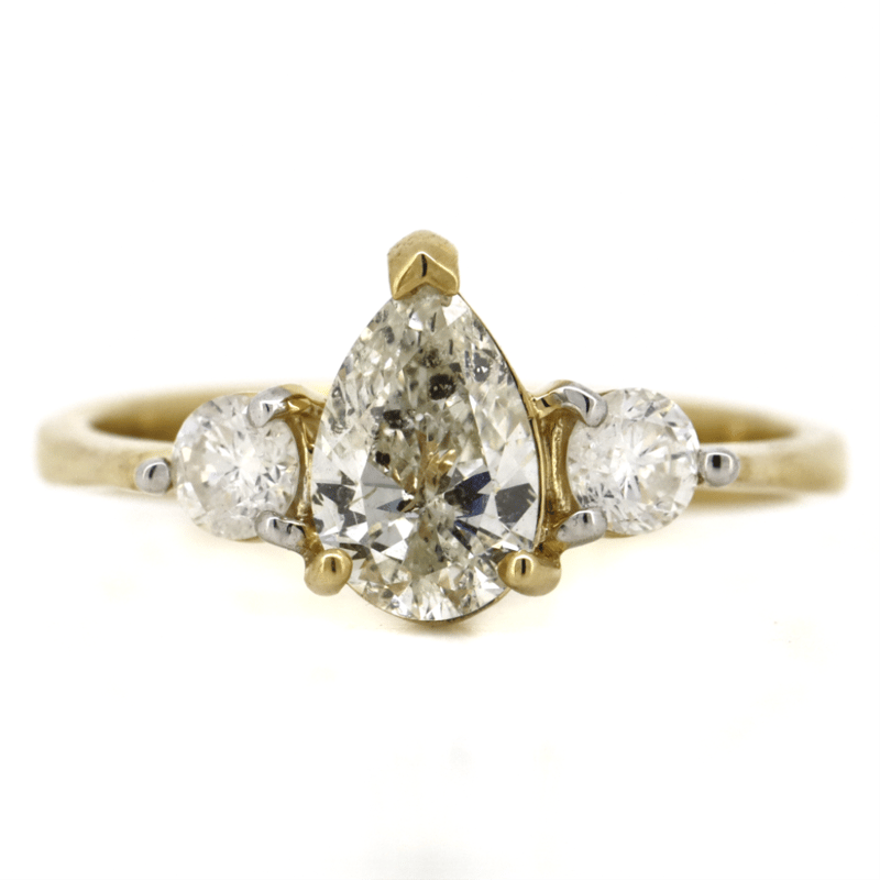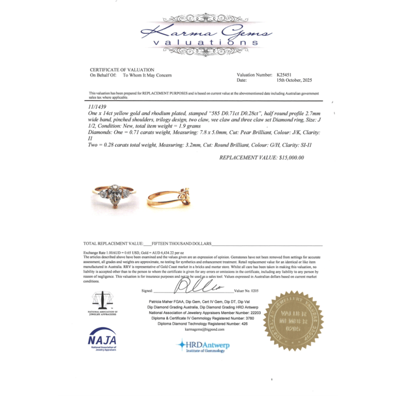14K YELLOW GOLD AND 0.99CT TDW DIAMOND, TRILOGY RING. The Centre Features, One Pear Brilliant Cut, Diamond (0.71Ct, J-K Colour, I1 Clarity), Claw Set. Accompanied By, 2 Round Brilliant Cut, Diamonds (0.28Ct Tdw, G-H Colour, Si-I1 Clarity), Claw Set. Ring Size J 1/2. Valuations Provided by an Independent Third-Party Professional Not Directly Associated With Lloyds Auctions at AUD $$15,000.00This valuation has been conducted by an independent third-party professional. The valuation amount is an assessment by the issuing valuer and does not reflect the auction value of the item. Any inquiries regarding the valuation should be directed to the issuing valuer (refer to contact details on the certificate), as Lloyds Auctions has no affiliation or influence over the valuation, the valuer, or the stated amount. Condition: Good - Refer Images 0645975+7