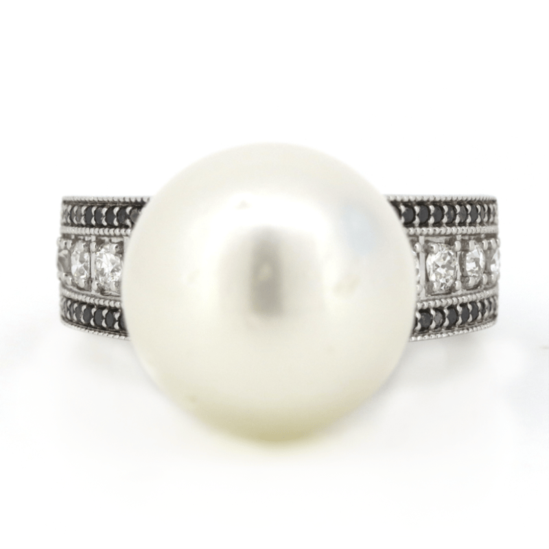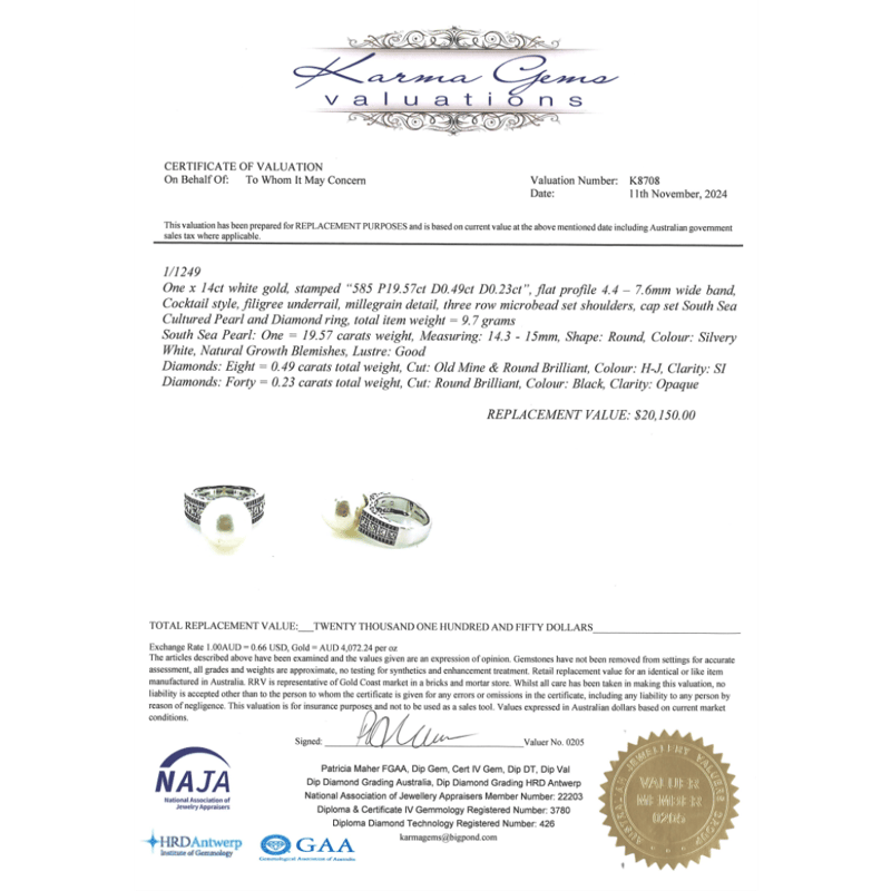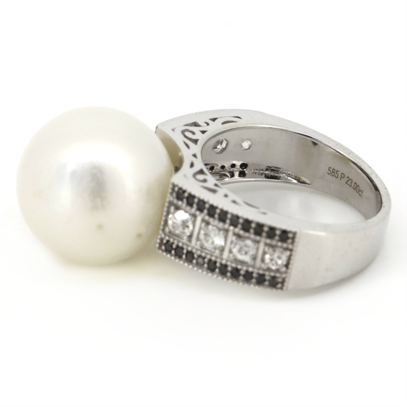 14K WHITE GOLD, WHITE CULTURED SOUTH SEA PEARL, DIAMOND AND BLACK DIAMOND, COCKTAIL RING. The Centre Features, One Round, Silvery White, Pearl Cultured South Sea Pearl (19.57Ct, Good Lustre). Cap Set. Decorating The Band Are, 8 Round Brilliant, Diamonds (0.49Ct Tdw, H-J Colour, Si Clarity), And 40 Round Brilliant Cut, Black, Diamonds (0.23Ct Tdw, Opaque ) Microbead Set. Ring Size N. Valuations Provided by an Independent Third-Party Professional Not Directly Associated With Lloyds Auctions at AUD $$20,150.00This valuation has been conducted by an independent third-party professional. The valuation amount is an assessment by the issuing valuer and does not reflect the auction value of the item. Any inquiries regarding the valuation should be directed to the issuing valuer (refer to contact details on the certificate), as Lloyds Auctions has no affiliation or influence over the valuation, the valuer, or the stated amount. Condition: Good - Refer Images 0645975+15