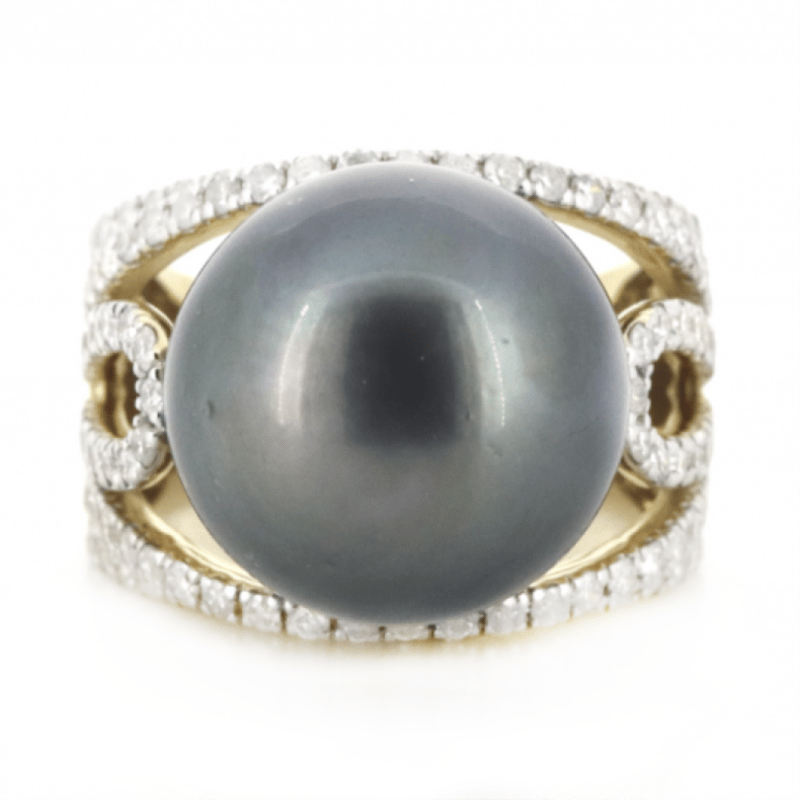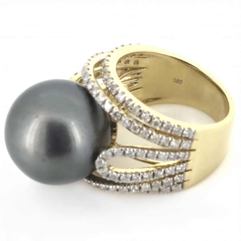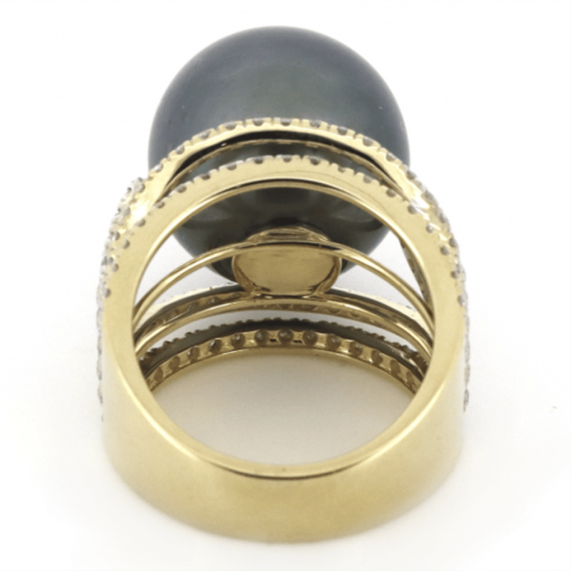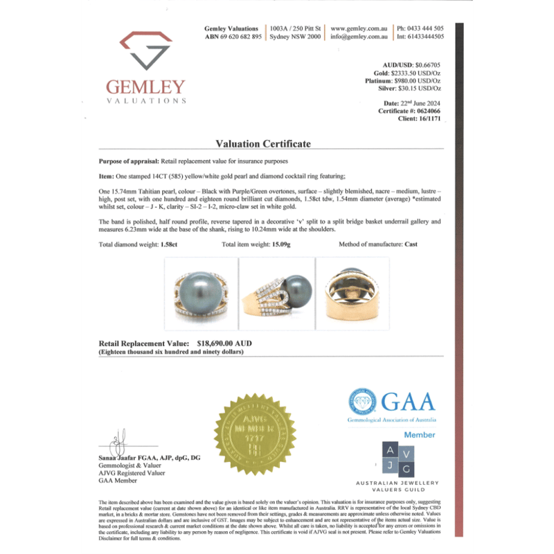 14K YELLOW GOLD, BLACK CULTURED TAHITIAN PEARL AND DIAMOND, COCKTAIL RING. The Centre Features, One Round, Black With Purple And Green Overtones, Cultured Tahitian Pearl (15.74Mm, Slightly Blemished, Medium Lustre, Naturally Cultured), Post Set. Encompassing The Design Are, 118 Round Brilliant Cut, Diamonds (1.58Ct Tdw, J-K Colour, Si2-I2 Clarity), Bead Set. Ring Size N 1/2. Valuations Provided by an Independent Third-Party Professional Not Directly Associated With Lloyds Auctions at AUD $$18,690.00This valuation has been conducted by an independent third-party professional. The valuation amount is an assessment by the issuing valuer and does not reflect the auction value of the item. Any inquiries regarding the valuation should be directed to the issuing valuer (refer to contact details on the certificate), as Lloyds Auctions has no affiliation or influence over the valuation, the valuer, or the stated amount. Condition: Good - Refer Images 0645975+16