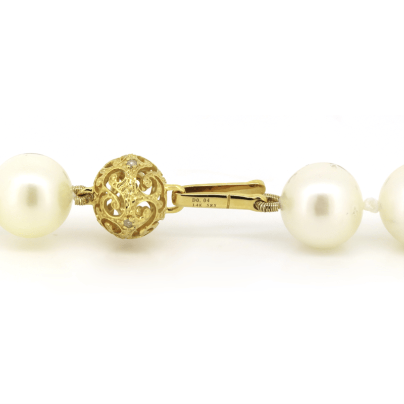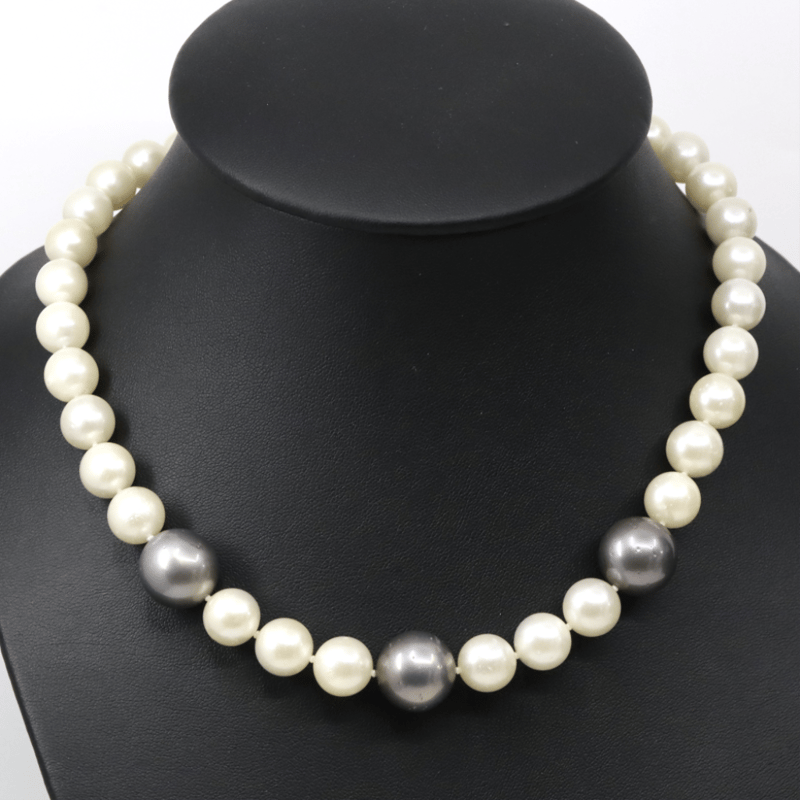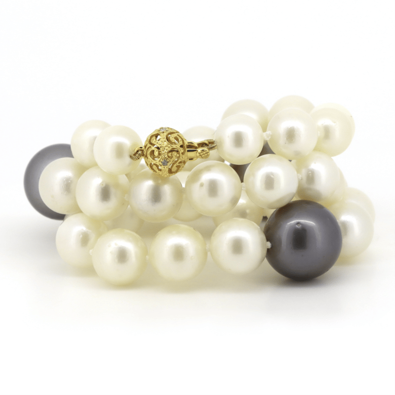 14K YELLOW GOLD, BLACK CULTURED TAHITIAN, WHITE CULTURED SOUTH SEA PEARL AND DIAMOND, STRAND NECKLACE. The Design Features, 3 Near Round, Black 2Ith Silver And Green Overtones, Cultured Tahitian Pearls (15.6Mm-16.0Mm Size, Good Lustre, Surface Blemishes). Encompassing The Design Are, 34 Near Round, White With Silver And Gold Overtones, Cultured South Sea Pearls (9.8Mm-12.0Mm Size, Good Lustre, Surface Blemishes), Strung In A Single Row. Embellishing The 14K Yellow Gold Filigree Ball Clasp Are, 4 Round Brilliant Cut, Diamonds (0.04Ct Tdw, G-J Colour, Si-I2 Clarity), Bead Set. Necklace Length Is 45Cm. Valuations Provided by an Independent Third-Party Professional Not Directly Associated With Lloyds Auctions at AUD $$17,500.00This valuation has been conducted by an independent third-party professional. The valuation amount is an assessment by the issuing valuer and does not reflect the auction value of the item. Any inquiries regarding the valuation should be directed to the issuing valuer (refer to contact details on the certificate), as Lloyds Auctions has no affiliation or influence over the valuation, the valuer, or the stated amount. Condition: Good - Refer Images 0645975+17