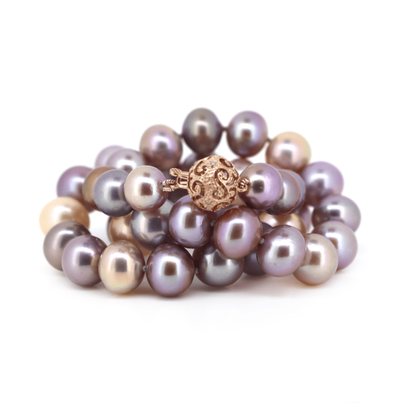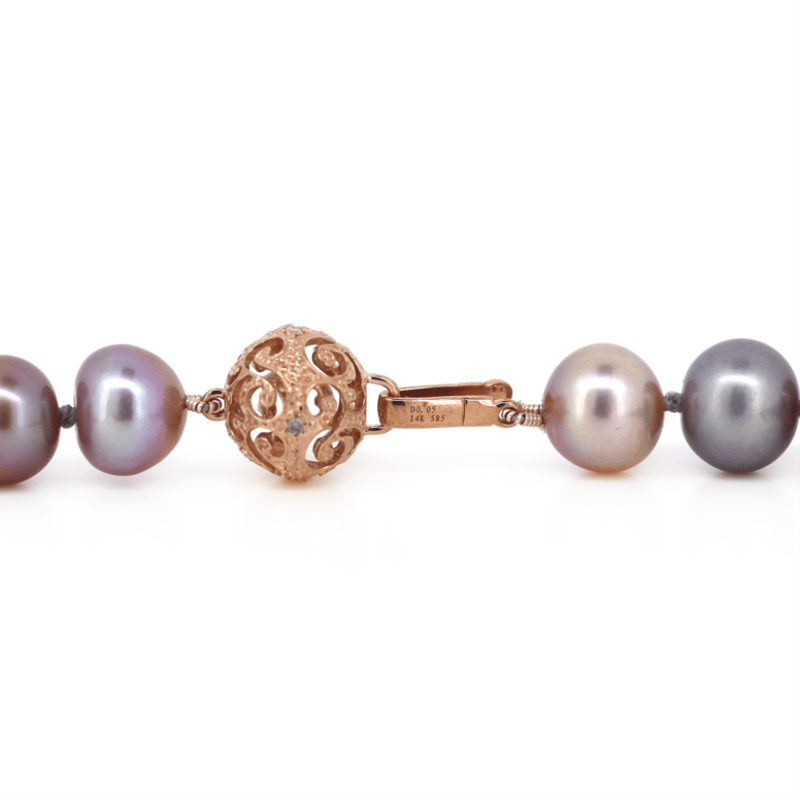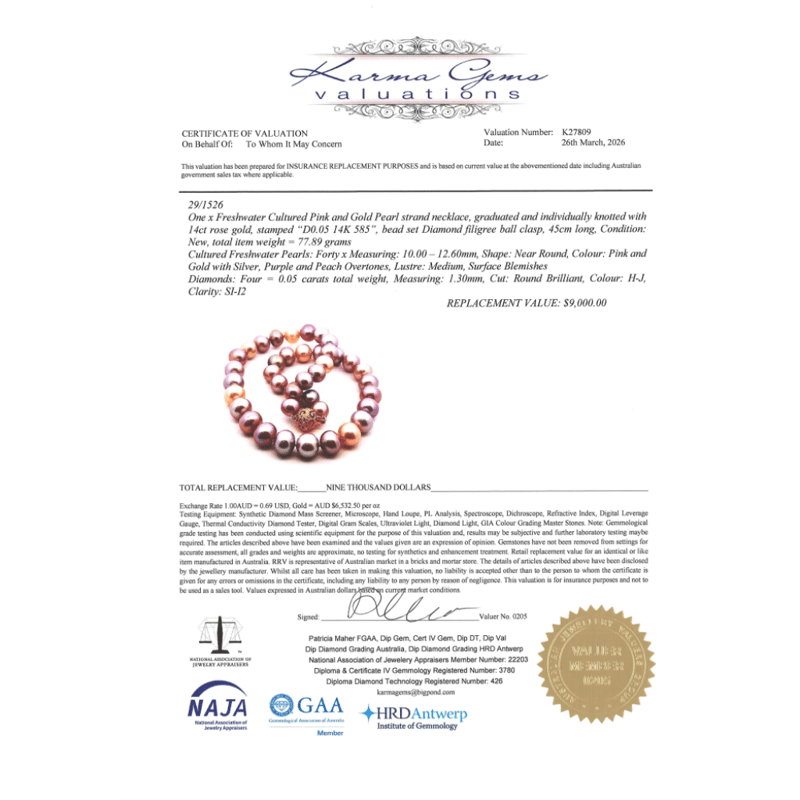 14K ROSE GOLD, GOLD/PINK CULTURED SOUTH SEA PEARL AND DIAMOND, STRAND NECKLACE. The Necklace Features, 40 Near Round, Pink And Gold With Silver, Purple And Peach Overtones, Cultured South Sea Pearls (10.00Mm-12.60Mm Size, Medium Lustre, Surface Blemishes), Induvial Knotted. Embellishing The 14K Rose Gold Filigree Ball Clasp Are, 4 Round Brilliant Cut, Diamonds (0.05Ct Tdw, H-J Colour, Si-I2 Clarity), Bead Set. Necklace Length Is 45Cm. Valuations Provided by an Independent Third-Party Professional Not Directly Associated With Lloyds Auctions at AUD $$9,000.00This valuation has been conducted by an independent third-party professional. The valuation amount is an assessment by the issuing valuer and does not reflect the auction value of the item. Any inquiries regarding the valuation should be directed to the issuing valuer (refer to contact details on the certificate), as Lloyds Auctions has no affiliation or influence over the valuation, the valuer, or the stated amount. Condition: Good - Refer Images 0645975+20