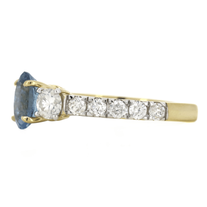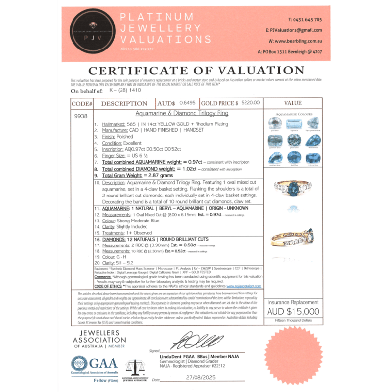 14K YELLOW GOLD, AQUAMARINE AND DIAMOND, DRESS RING. The Centre Features, One Oval Mixed Cut, Strong Moderate Blue, Aquamarine (0.97Ct, Slightly Included, Enhanced), 4 Claw Set. Accompanied By, 12 Round Brilliant Cut, Diamonds (1.02Ct Tdw, G-H Colour, Si1-Si2 Clarity), Claw Set. Ring Size M 1/2. Valuations Provided by an Independent Third-Party Professional Not Directly Associated With Lloyds Auctions at AUD $$15,000.00This valuation has been conducted by an independent third-party professional. The valuation amount is an assessment by the issuing valuer and does not reflect the auction value of the item. Any inquiries regarding the valuation should be directed to the issuing valuer (refer to contact details on the certificate), as Lloyds Auctions has no affiliation or influence over the valuation, the valuer, or the stated amount. Condition: Good - Refer Images 0645975+21