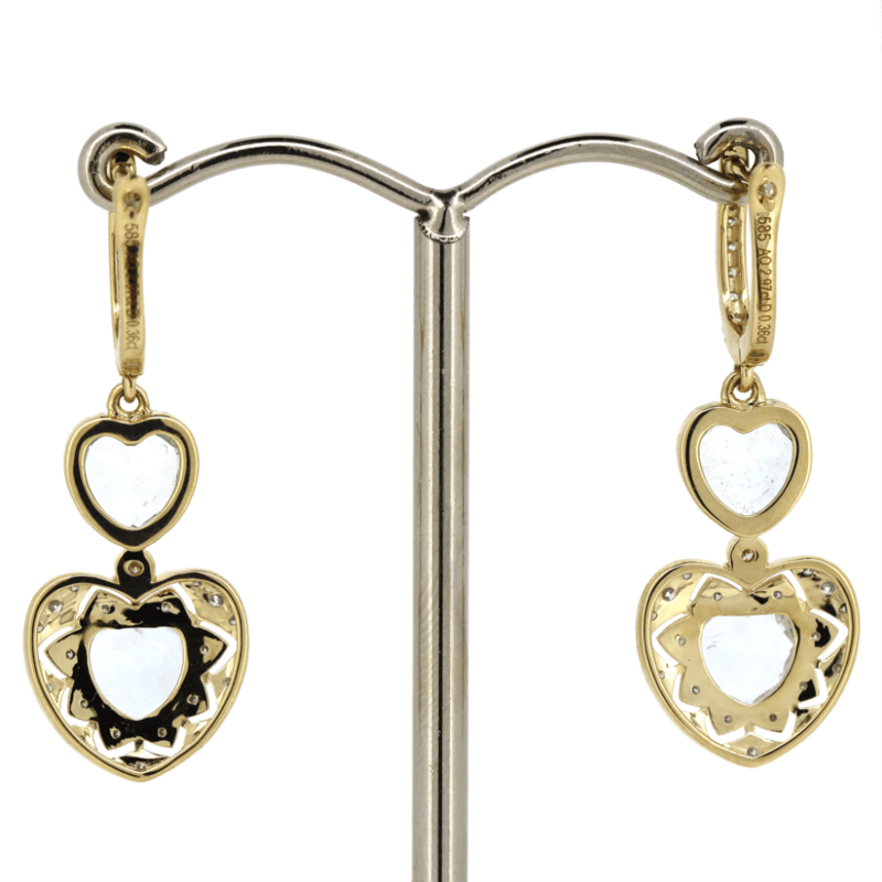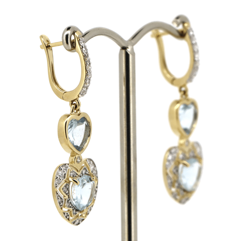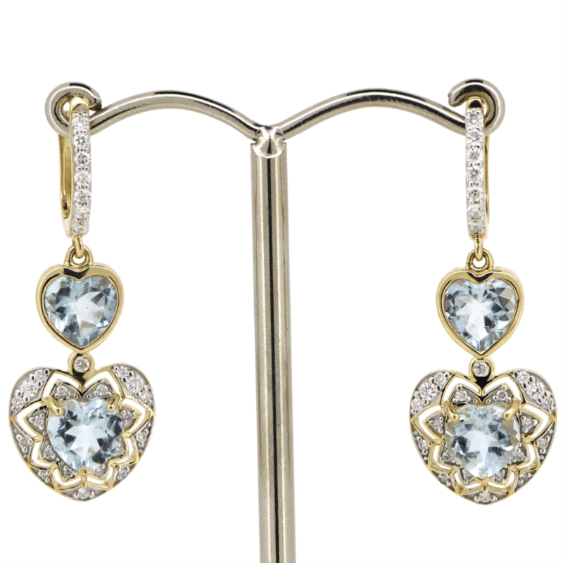 14K YELLOW GOLD, AQUAMARINE AND DIAMOND, DROP EARRINGS. The Earrings Feature, 4 Heart Faceted Cut, Aquamarines (2.97Ct Tsw, Eye Visible Inclusions), Bezel Set. Encompassing The Centre And Decorating The Drops Are, 54 Round Brilliant Cut, Diamonds (0.36Ct Tdw, G-I Colour, Si-I2 Clarity), Bead Set. The Earrings Feature Tension Spring Clasps. Valuations Provided by an Independent Third-Party Professional Not Directly Associated With Lloyds Auctions at AUD $$13,800.00This valuation has been conducted by an independent third-party professional. The valuation amount is an assessment by the issuing valuer and does not reflect the auction value of the item. Any inquiries regarding the valuation should be directed to the issuing valuer (refer to contact details on the certificate), as Lloyds Auctions has no affiliation or influence over the valuation, the valuer, or the stated amount. Condition: Good - Refer Images 0645975+24