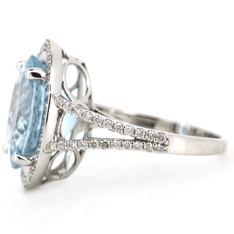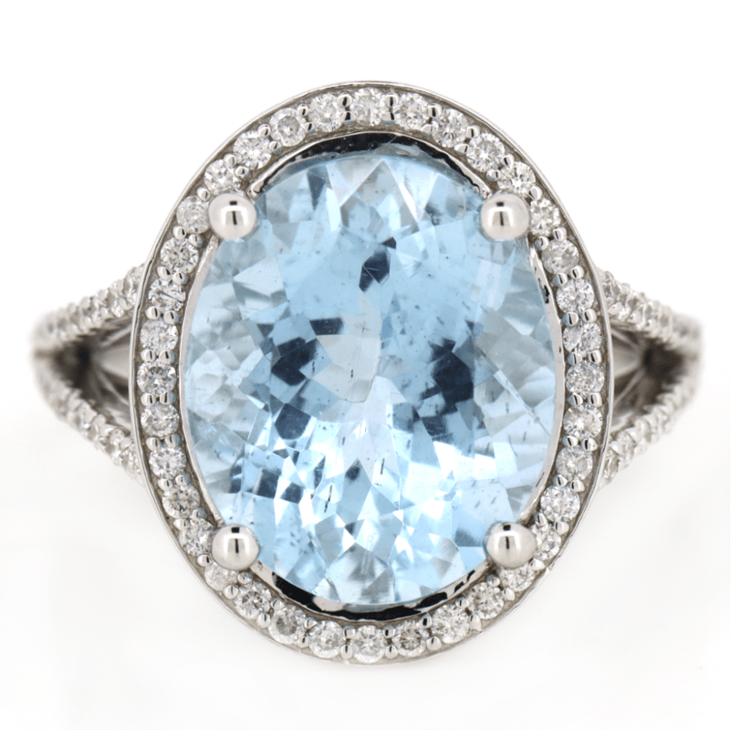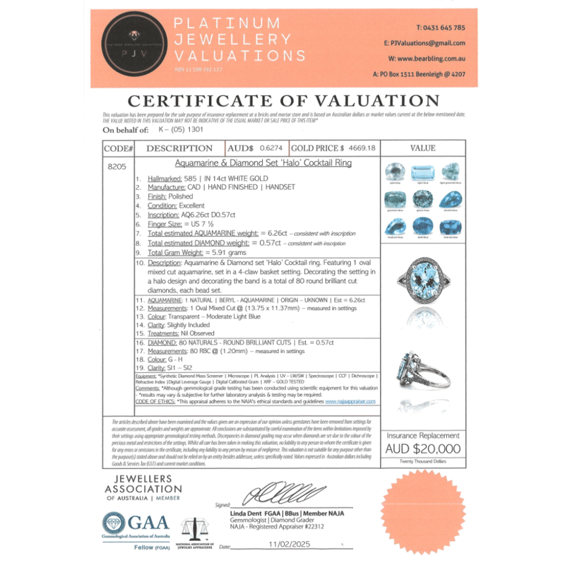 14K WHITE GOLD, AQUAMARINE AND DIAMOND, COCKTAIL RING. The Centre Features, One Oval Cut, Moderate Light Blue, Aquamarine (6.26Ct, Lightly Included), 4 Claw Set. Surrounding The Centre In A Halo And Decorating The Band Are, 80 Round Brilliant Cut, Diamonds (0.57Ct Tdw, G-H Colour, Si1-Si2 Clarity), Bead Set. Ring Size O. Valuations Provided by an Independent Third-Party Professional Not Directly Associated With Lloyds Auctions at AUD $$20,000.00This valuation has been conducted by an independent third-party professional. The valuation amount is an assessment by the issuing valuer and does not reflect the auction value of the item. Any inquiries regarding the valuation should be directed to the issuing valuer (refer to contact details on the certificate), as Lloyds Auctions has no affiliation or influence over the valuation, the valuer, or the stated amount. Condition: Good - Refer Images 0645975+26