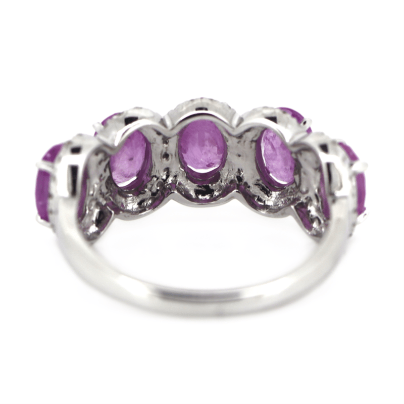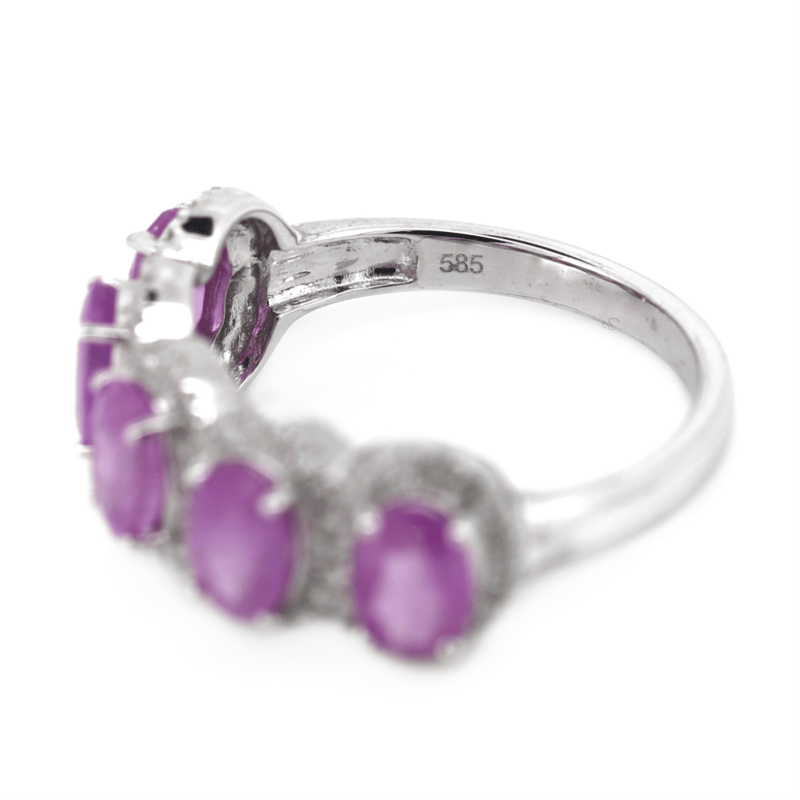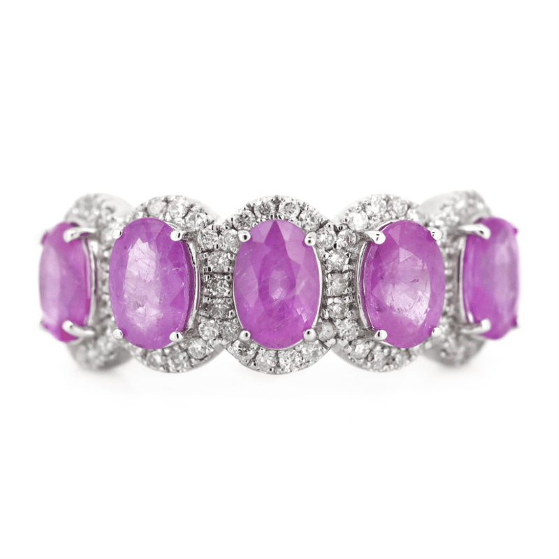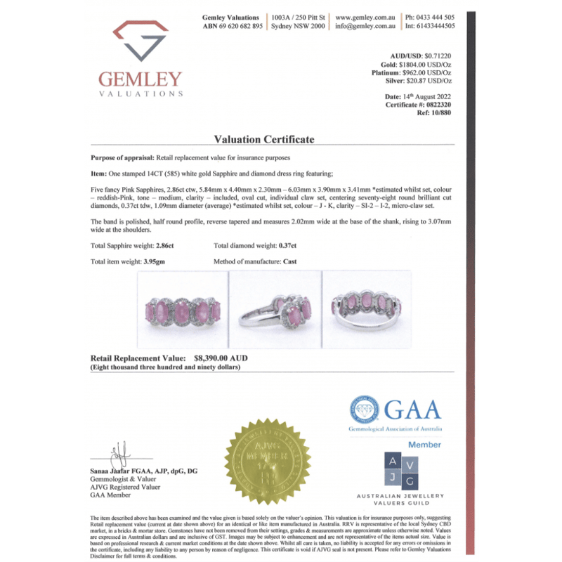 14K WHITE GOLD, PINK SAPPHIRE AND DIAMOND, ETERNITY RING. The Centre Features, 5 Oval Cut, Medium Reddish-Pink, Sapphires (2.86Ct Tsw, Included), Claw Set. Surrounding The Centres In Halos Are, 78 Round Brilliant Cut, Diamonds (0.37Ct Tdw, J-K Colour, Si2-I2 Clarity), Micro-Claw Set. Ring Size M. Valuations Provided by an Independent Third-Party Professional Not Directly Associated With Lloyds Auctions at AUD $$8,390.00This valuation has been conducted by an independent third-party professional. The valuation amount is an assessment by the issuing valuer and does not reflect the auction value of the item. Any inquiries regarding the valuation should be directed to the issuing valuer (refer to contact details on the certificate), as Lloyds Auctions has no affiliation or influence over the valuation, the valuer, or the stated amount. Condition: Good - Refer Images 0645975+31