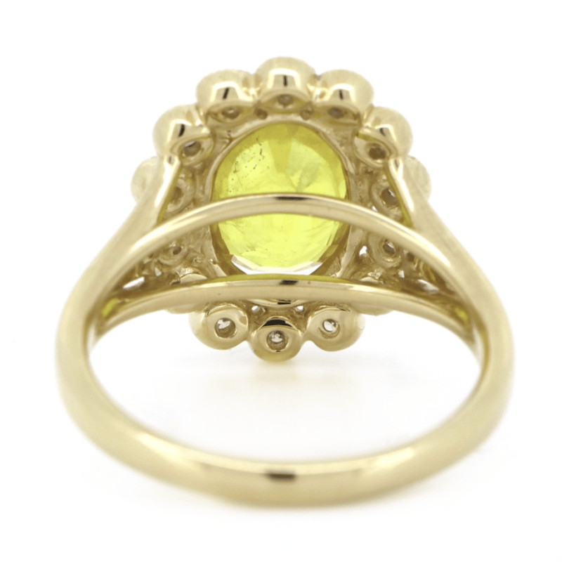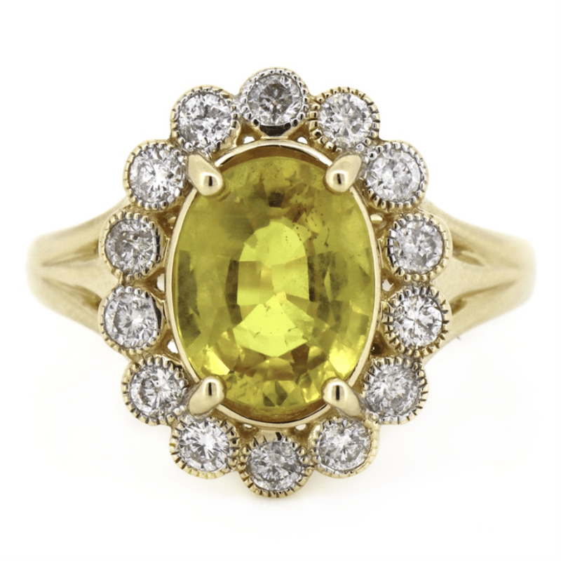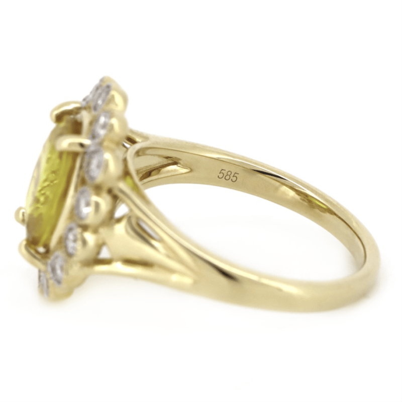 14K YELLOW GOLD, YELLOW SAPPHIRE AND DIAMOND, HALO RING. The Centre Features, One Oval Cut, Golden Yellow, Sapphire (3.06Ct, Lightly Included), 4 Claw Set. Surrounding The Centre In A Halo Are, 14 Round Brilliant Cut, Diamonds (0.56Ct Tdw, H-I Colour, Si-I1 Clarity), Individually Bead Set With Millegrain. Ring Size O. Valuations Provided by an Independent Third-Party Professional Not Directly Associated With Lloyds Auctions at AUD $$16,600.00This valuation has been conducted by an independent third-party professional. The valuation amount is an assessment by the issuing valuer and does not reflect the auction value of the item. Any inquiries regarding the valuation should be directed to the issuing valuer (refer to contact details on the certificate), as Lloyds Auctions has no affiliation or influence over the valuation, the valuer, or the stated amount. Condition: Good - Refer Images 0645975+32