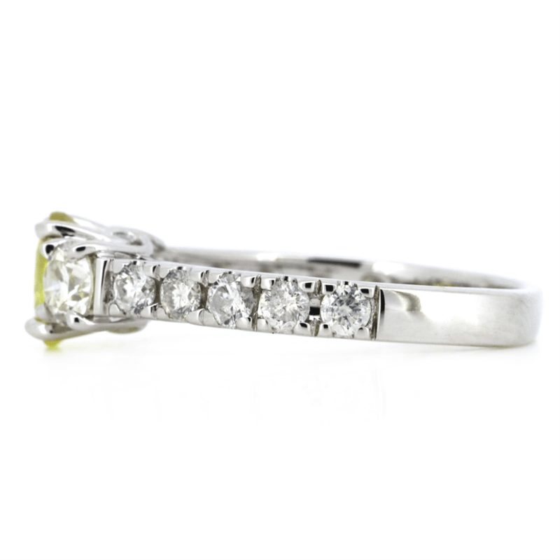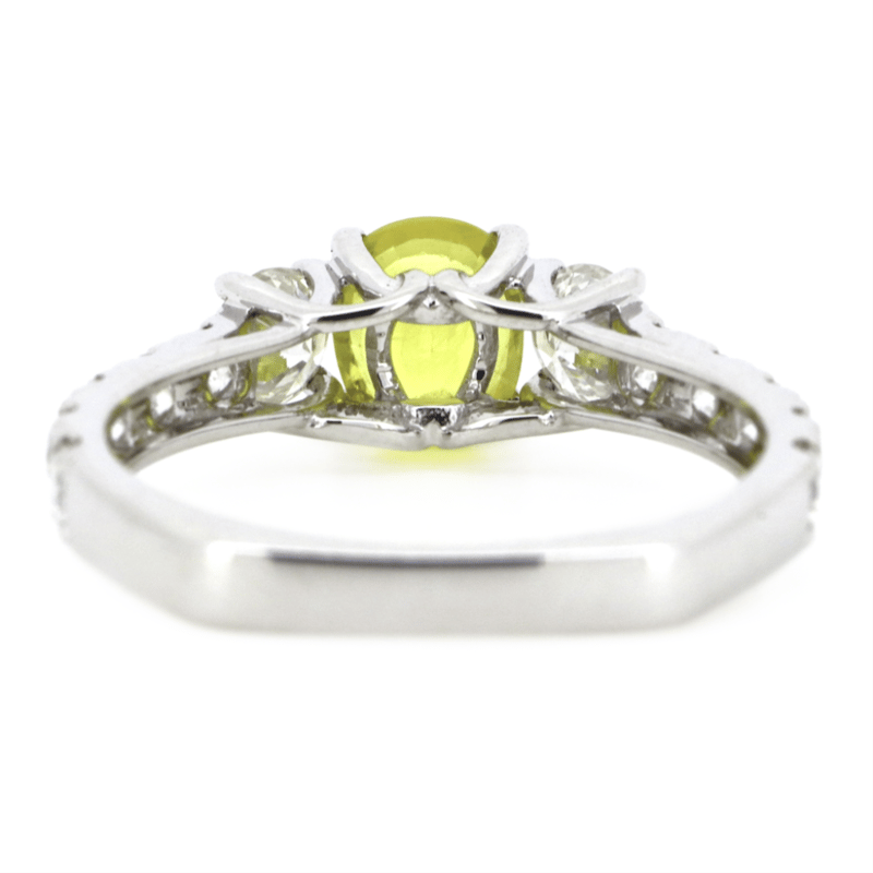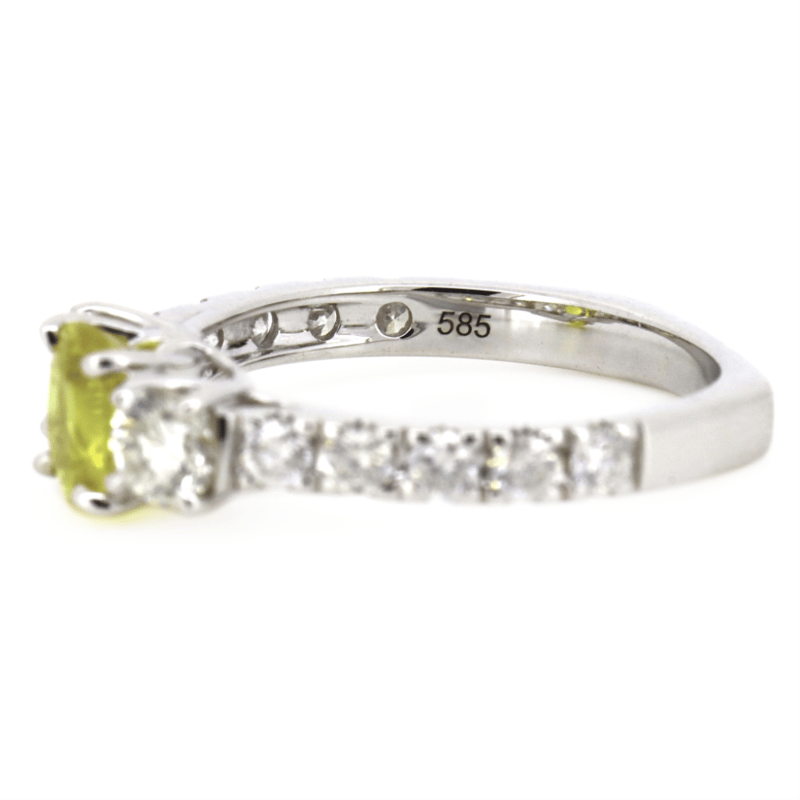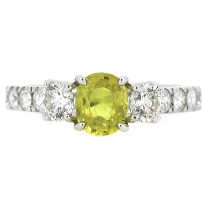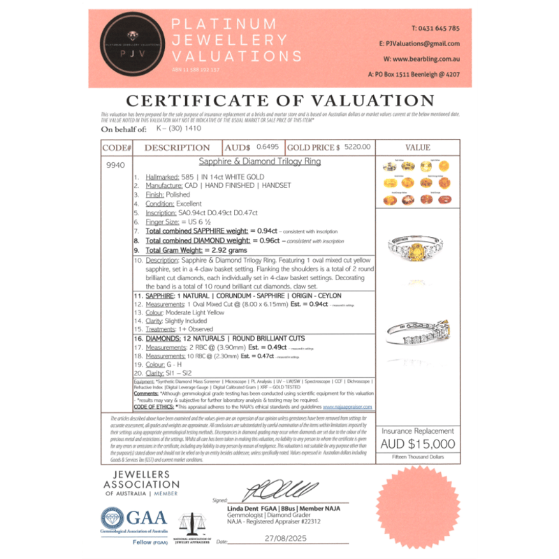 14K WHITE GOLD, 0.94CT YELLOW CEYLON SAPPHIRE AND DIAMOND, DRESS RING. The Centre Features, One Oval Cut, Moderate Light Yellow, Ceylon Sapphire (0.94Ct, Slightly Included, Enhanced), 4 Claw Set. Accompanied By, 12 Round Brilliant Cut, Diamonds (0.96Ct Tdw, G-H Colour, Si1-Si2 Clarity), Claw Set. Ring Size M 1/2. Valuations Provided by an Independent Third-Party Professional Not Directly Associated With Lloyds Auctions at AUD $$15,000.00This valuation has been conducted by an independent third-party professional. The valuation amount is an assessment by the issuing valuer and does not reflect the auction value of the item. Any inquiries regarding the valuation should be directed to the issuing valuer (refer to contact details on the certificate), as Lloyds Auctions has no affiliation or influence over the valuation, the valuer, or the stated amount. Condition: Good - Refer Images 0645975+35