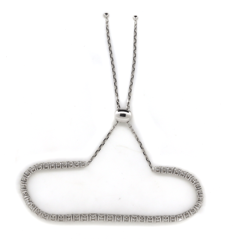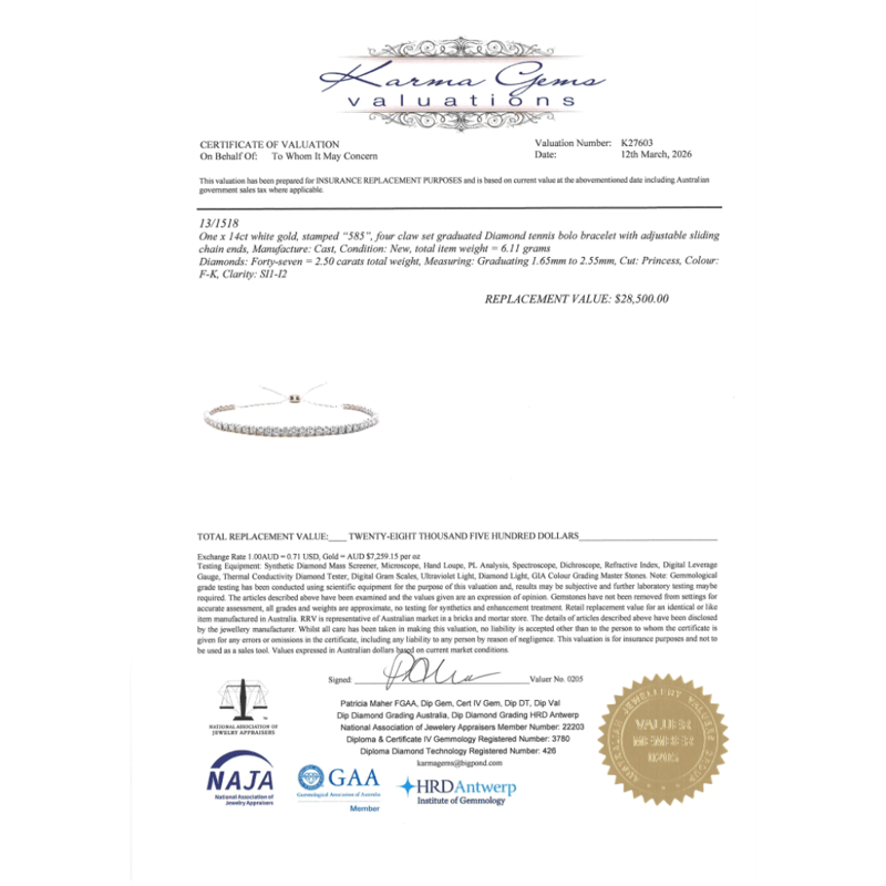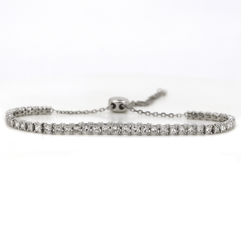 14K WHITE GOLD AND 2.50CT TDW DIAMOND, GRADUATED TENNIS BOLO BRACELET. The Bracelet Features, 47 Princess Cut, Diamonds (2.50Ct Tdw, F-K Colour, Si1-I2 Clarity), Claw Set. The Bracelet Feature A Adjustable Sliding Chain. Valuations Provided by an Independent Third-Party Professional Not Directly Associated With Lloyds Auctions at AUD $$28,500.00This valuation has been conducted by an independent third-party professional. The valuation amount is an assessment by the issuing valuer and does not reflect the auction value of the item. Any inquiries regarding the valuation should be directed to the issuing valuer (refer to contact details on the certificate), as Lloyds Auctions has no affiliation or influence over the valuation, the valuer, or the stated amount. Condition: Good - Refer Images 0645975+38