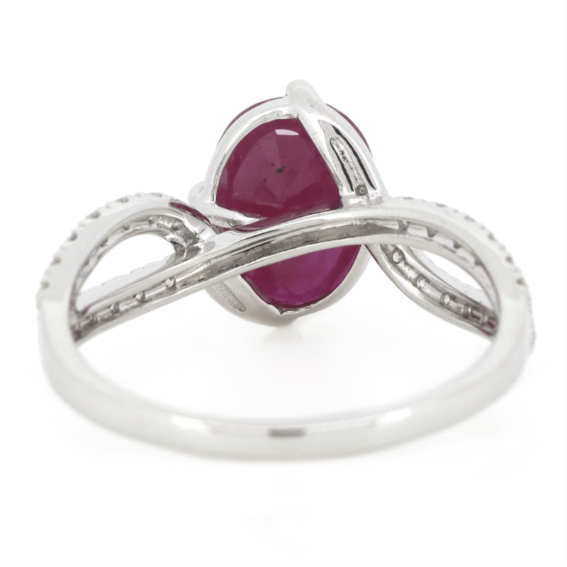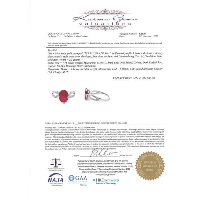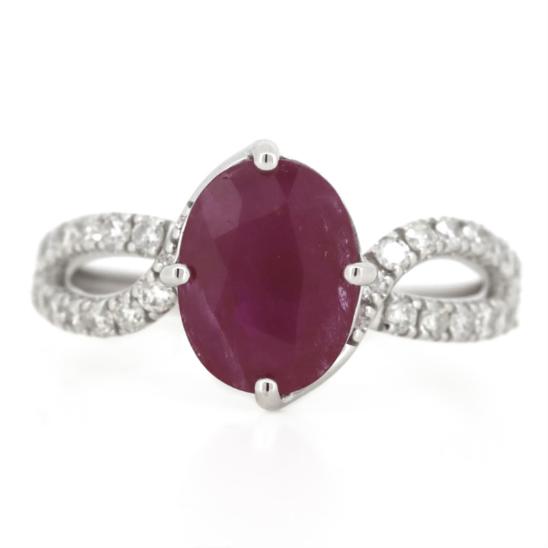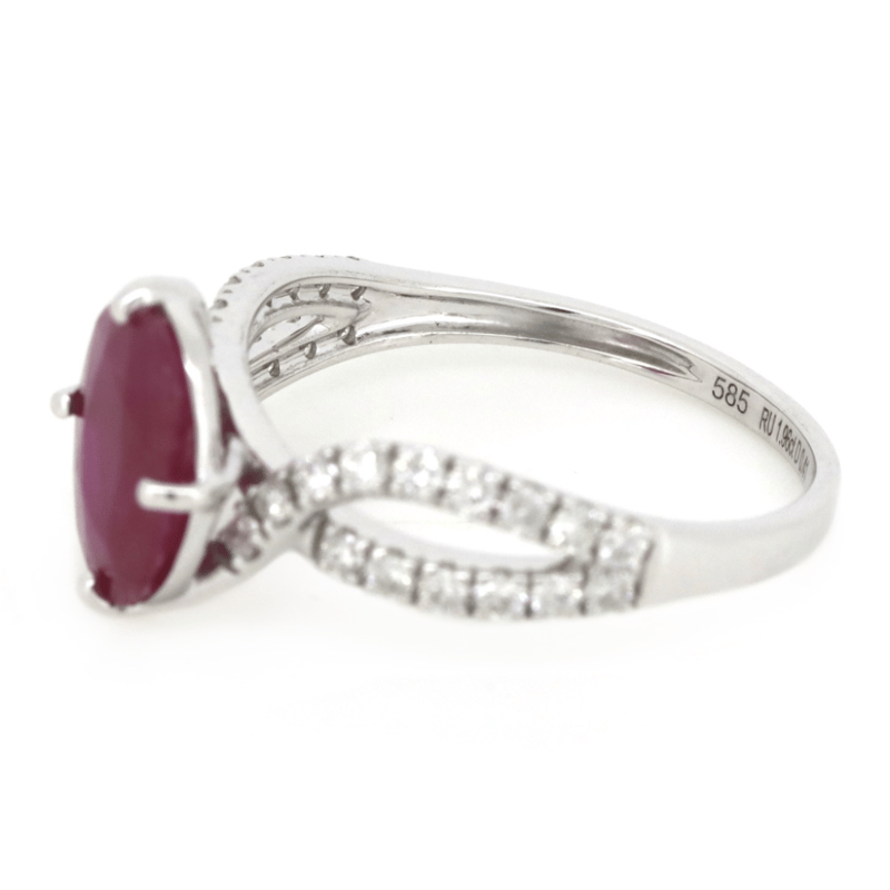 14K WHITE GOLD, RUBY AND DIAMOND, TWIST BAND RING. The Centre Features, One Oval Cut, Dark Pinkish-Red, Ruby (1.96Ct, Surface Reaching Inclusions), Claw Set. Decorating The Twist Band Are, 30 Round Brilliant Cut, Diamonds (0.41Ct Tdw, G-J Colour, Si-I2 Clarity), Micro-Claw Set. Ring Size M. Valuations Provided by an Independent Third-Party Professional Not Directly Associated With Lloyds Auctions at AUD $$14,800.00This valuation has been conducted by an independent third-party professional. The valuation amount is an assessment by the issuing valuer and does not reflect the auction value of the item. Any inquiries regarding the valuation should be directed to the issuing valuer (refer to contact details on the certificate), as Lloyds Auctions has no affiliation or influence over the valuation, the valuer, or the stated amount. Condition: Good - Refer Images 0645975+45