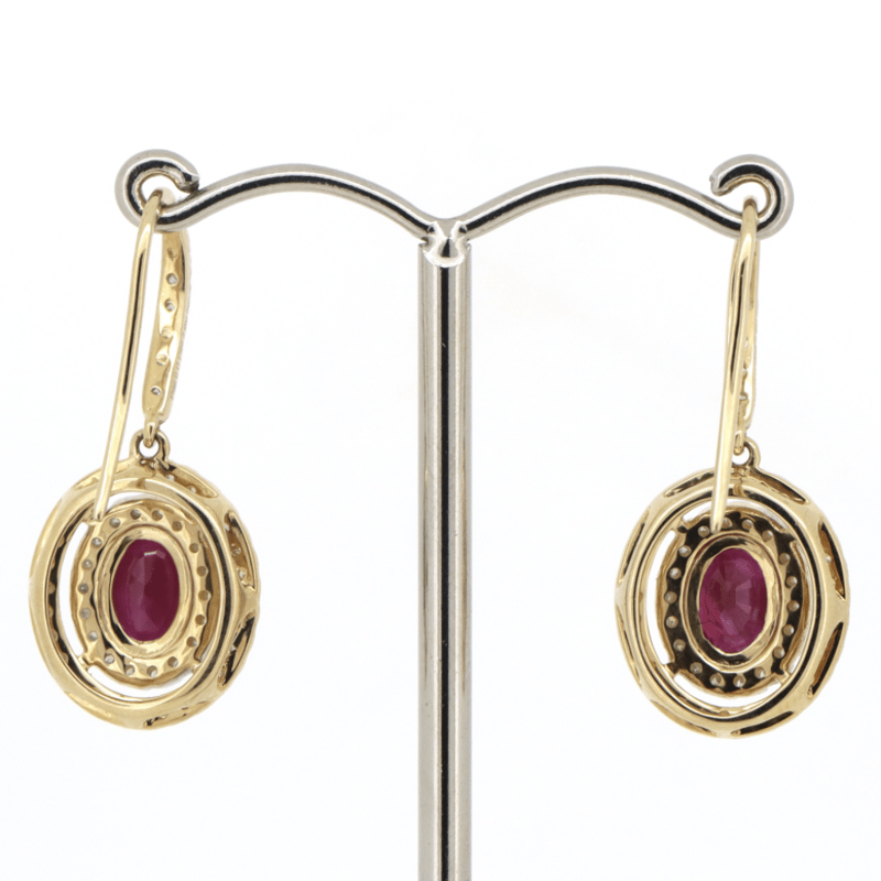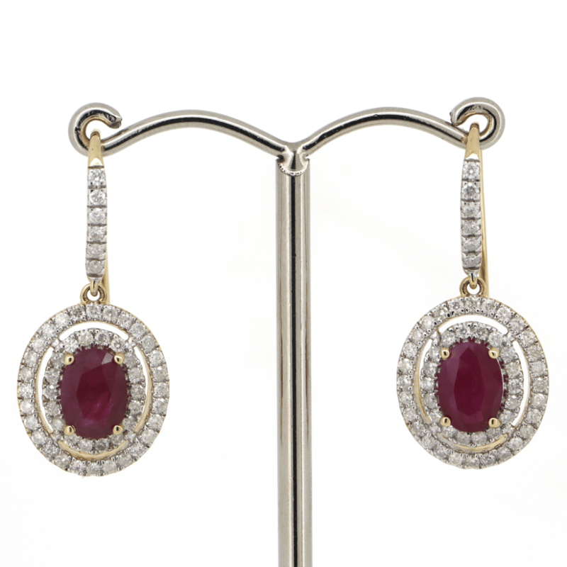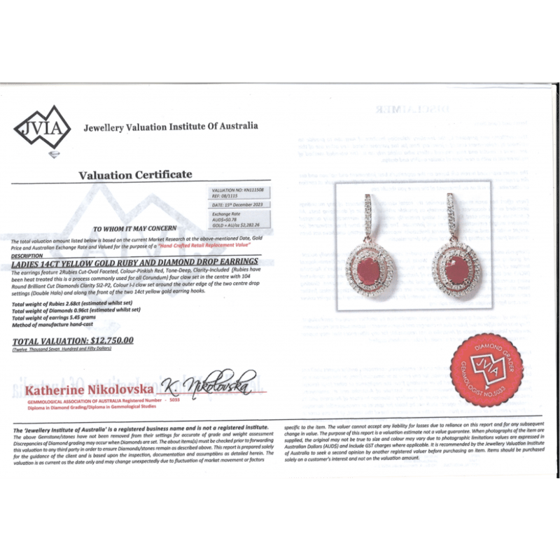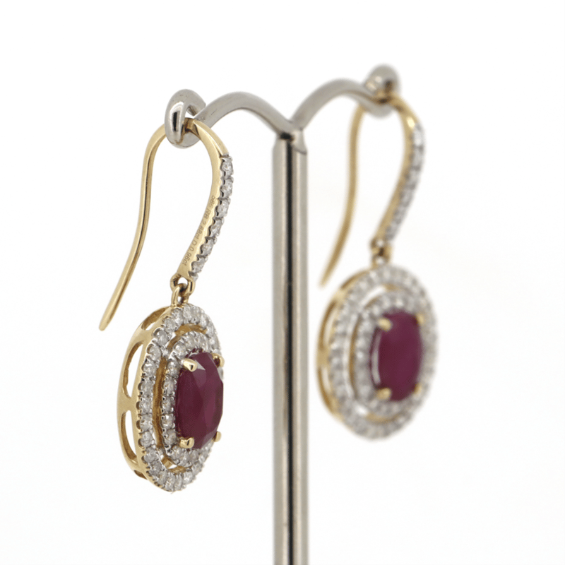 14K YELLOW GOLD, RUBY AND DIAMOND, DOUBLE HALO DROP EARRINGS. The Centre Features, 2 Oval Faceted Cut, Deep Pinkish-Red, Rubies (2.68Ct, Included, Heat Enhanced), 4 Claw Set. Surrounding The Centre In A Double Halo And Decorating The Hooks Are, 104 Round Brilliant Cut, Diamonds (0.96Ct Tdw, I-J Colour, Si2-P2 Clarity), Claw Set. The Earrings Have Shepherd Hooks. Valuations Provided by an Independent Third-Party Professional Not Directly Associated With Lloyds Auctions at AUD $$12,750.00This valuation has been conducted by an independent third-party professional. The valuation amount is an assessment by the issuing valuer and does not reflect the auction value of the item. Any inquiries regarding the valuation should be directed to the issuing valuer (refer to contact details on the certificate), as Lloyds Auctions has no affiliation or influence over the valuation, the valuer, or the stated amount. Condition: Good - Refer Images 0645975+46
