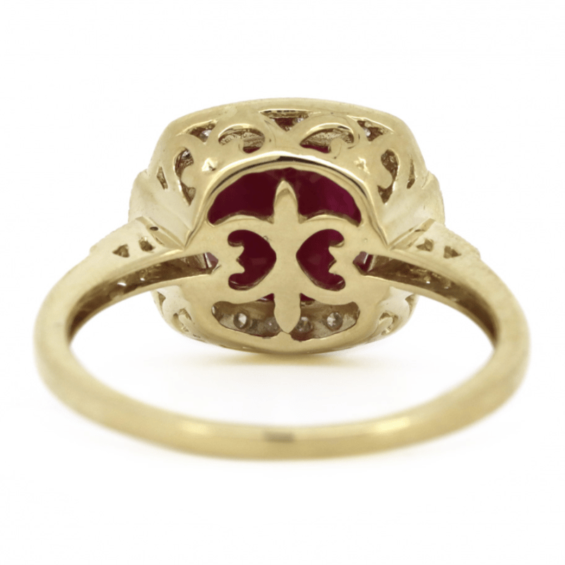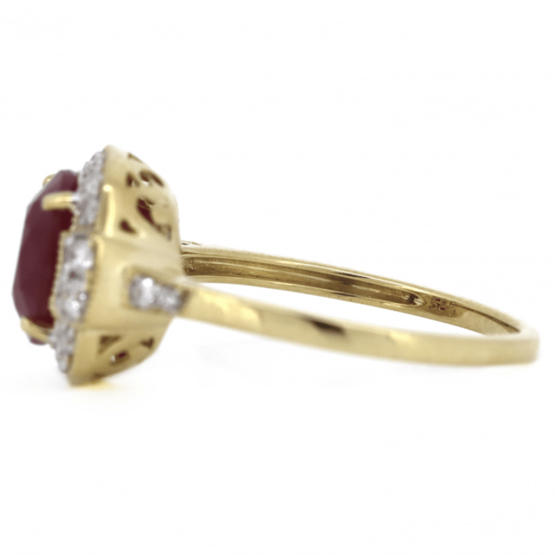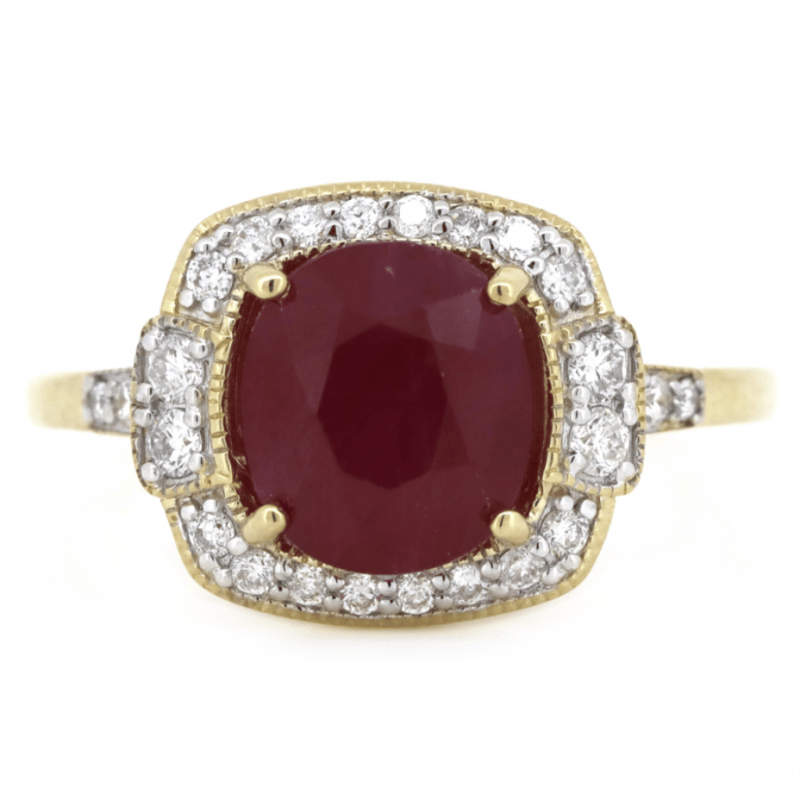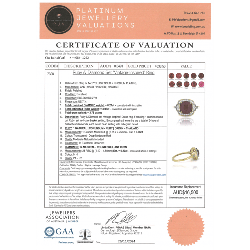 14K YELLOW GOLD, RUBY AND DIAMOND, VINTAGE INSPIRED RING. The Centre Features, One Fancy Cushion Mixed Cut, Ruby (3.06Ct, Moderate Inclusions), Claw Set In Yellow Gold. Encompassing The Centre Are, 24 Round Brilliant Cut, Diamonds (0.27Ct Tdw, H-I Colour, P1-P2 Clarity), Bead Set In Yellow Gold With Millegrain Detail. Ring Size O. Valuations Provided by an Independent Third-Party Professional Not Directly Associated With Lloyds Auctions at AUD $$16,500.00This valuation has been conducted by an independent third-party professional. The valuation amount is an assessment by the issuing valuer and does not reflect the auction value of the item. Any inquiries regarding the valuation should be directed to the issuing valuer (refer to contact details on the certificate), as Lloyds Auctions has no affiliation or influence over the valuation, the valuer, or the stated amount. Condition: Good - Refer Images 0645975+48
