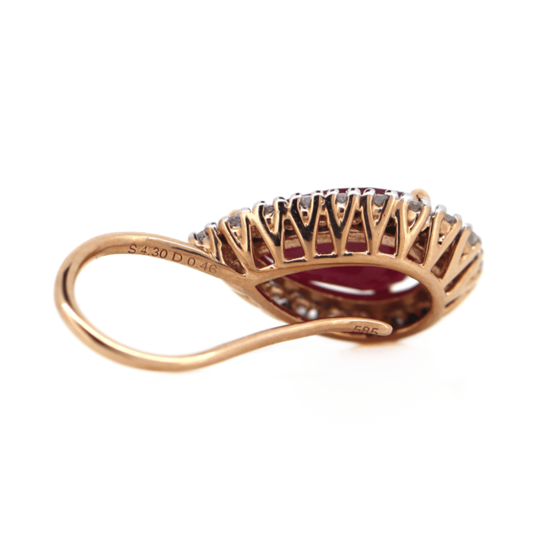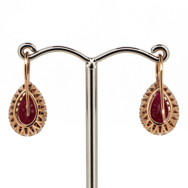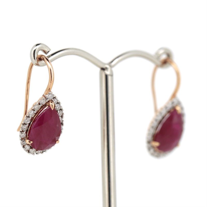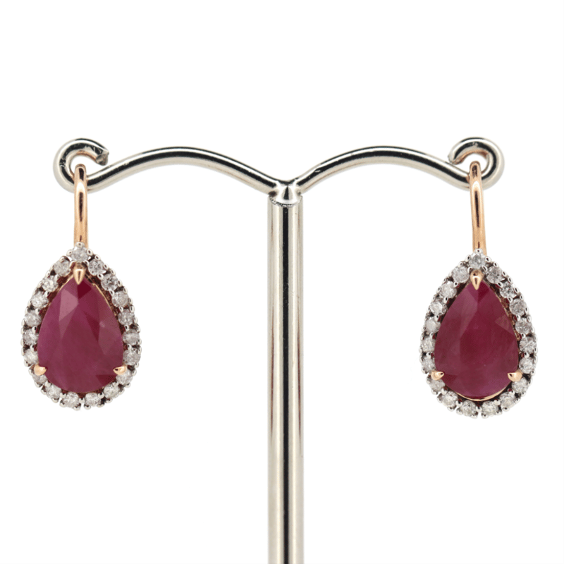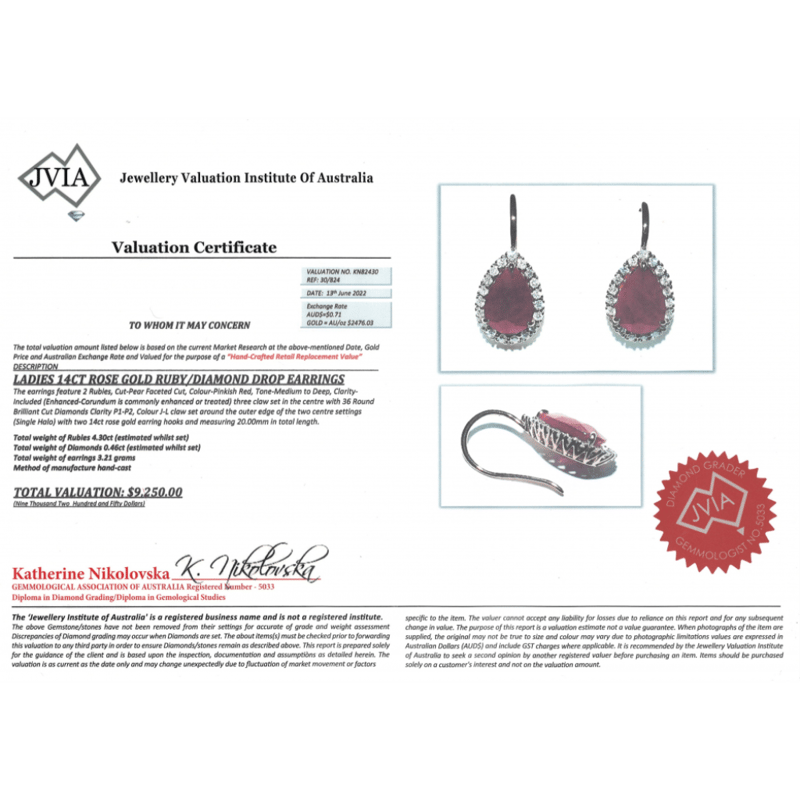 14K ROSE GOLD, RUBY AND DIAMOND, HALO DROP EARRINGS. The Centres Feature, 2 Pear Faceted Cut, Pinkish-Red, Rubies (4.30Ct Tsw, Included, Enhanced), 3 Claw Set. Surrounding The Centres In Halos Are, 36 Round Brilliant Cut, Diamonds (0.46Ct Tdw, J-L Colour, P1-P2 Clarity), Claw Set. The Earrings Have Shepherd Hooks. Valuations Provided by an Independent Third-Party Professional Not Directly Associated With Lloyds Auctions at AUD $$9,250.00This valuation has been conducted by an independent third-party professional. The valuation amount is an assessment by the issuing valuer and does not reflect the auction value of the item. Any inquiries regarding the valuation should be directed to the issuing valuer (refer to contact details on the certificate), as Lloyds Auctions has no affiliation or influence over the valuation, the valuer, or the stated amount. Condition: Good - Refer Images 0645975+49