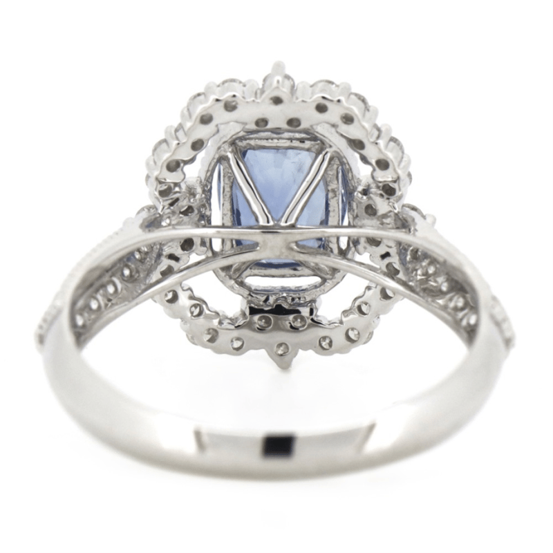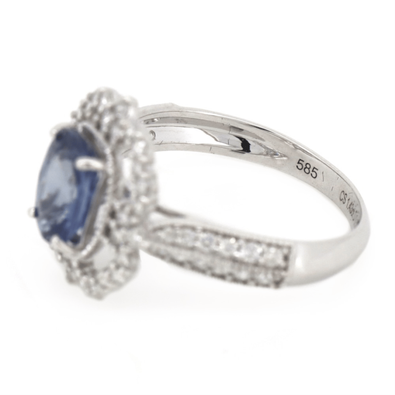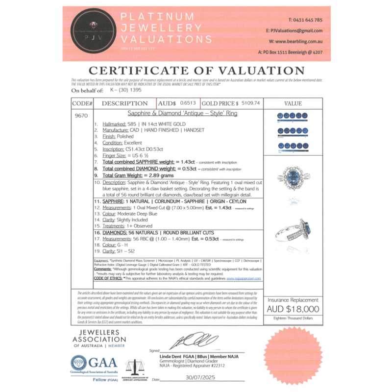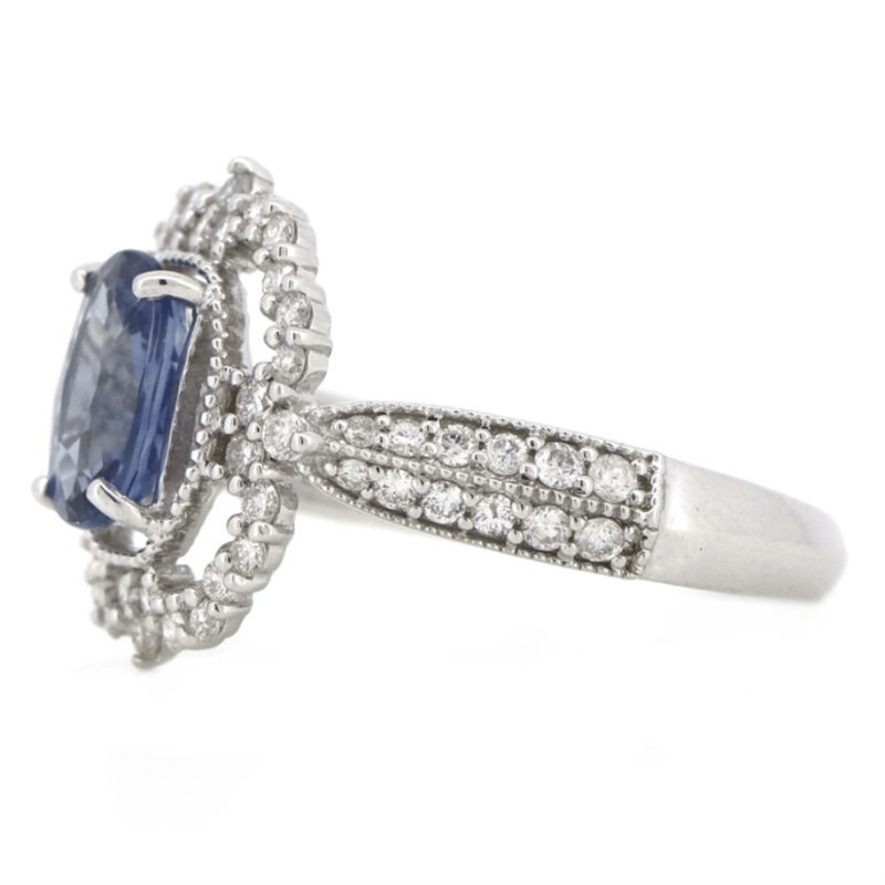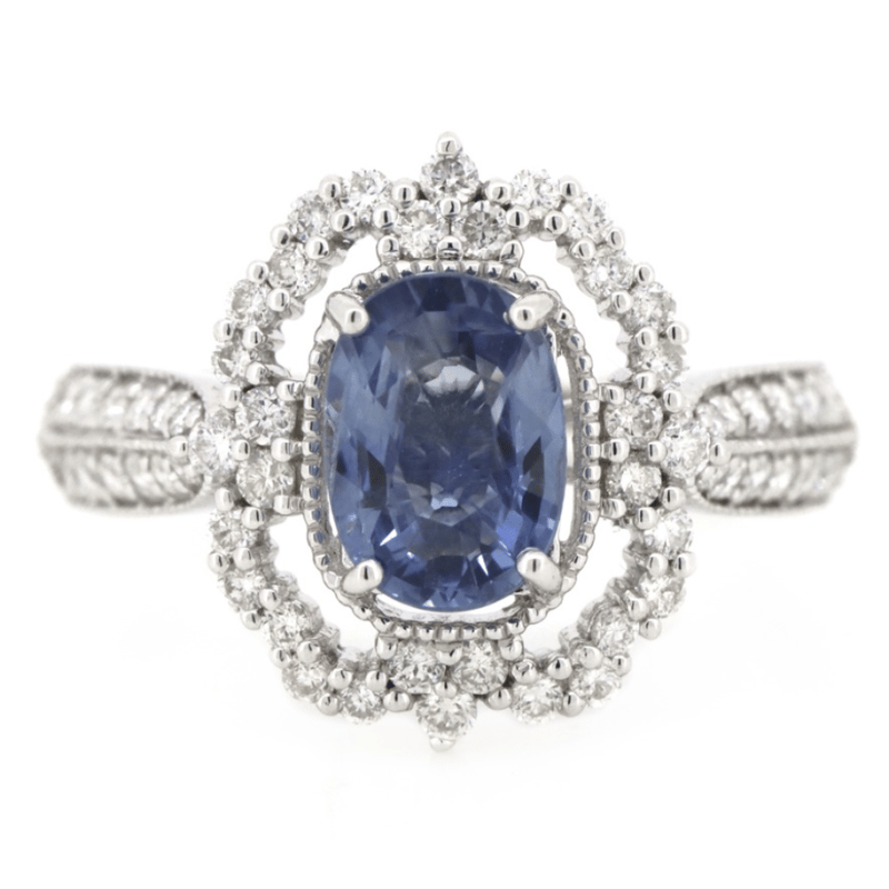 14K WHITE GOLD, 1.43CT BLUE CEYLON SAPPHIRE AND DIAMOND, ANTIQUE INSPIRED RING. The Centre Features, One Oval Cut, Moderate Deep Blue, Ceylon Sapphire (1.43Ct, Slight Inclusions), Claw Set. Decorating The Setting And The Band Are, 56 Round Brilliant Cut, Diamonds (0.53Ct Tdw, G-H Colour, Si1-Si2 Clarity), Claw/Bead Set With Millegrain Detail. Ring Size M 1/2. Valuations Provided by an Independent Third-Party Professional Not Directly Associated With Lloyds Auctions at AUD $$18,000.00This valuation has been conducted by an independent third-party professional. The valuation amount is an assessment by the issuing valuer and does not reflect the auction value of the item. Any inquiries regarding the valuation should be directed to the issuing valuer (refer to contact details on the certificate), as Lloyds Auctions has no affiliation or influence over the valuation, the valuer, or the stated amount. Condition: Good - Refer Images 0645975+53