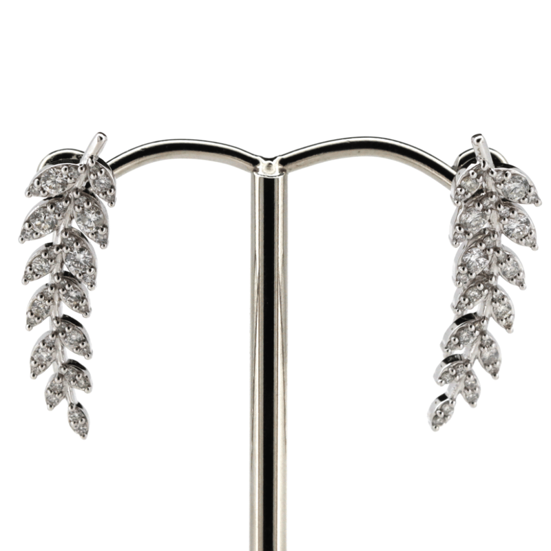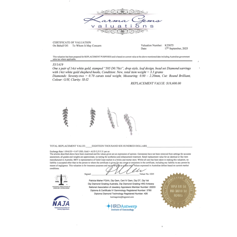 14K WHITE GOLD AND DIAMOND, FERN STYLE EARRINGS. The Design Features, 72 Round Brilliant Cut, Diamonds (0.70Ct Tdw, G-H Colour, Si-I2 Clarity), Bead Set. The Earrings Have Hook Backs. Valuations Provided by an Independent Third-Party Professional Not Directly Associated With Lloyds Auctions at AUD $$18,600.00This valuation has been conducted by an independent third-party professional. The valuation amount is an assessment by the issuing valuer and does not reflect the auction value of the item. Any inquiries regarding the valuation should be directed to the issuing valuer (refer to contact details on the certificate), as Lloyds Auctions has no affiliation or influence over the valuation, the valuer, or the stated amount. Condition: Good - Refer Images 0645975+57