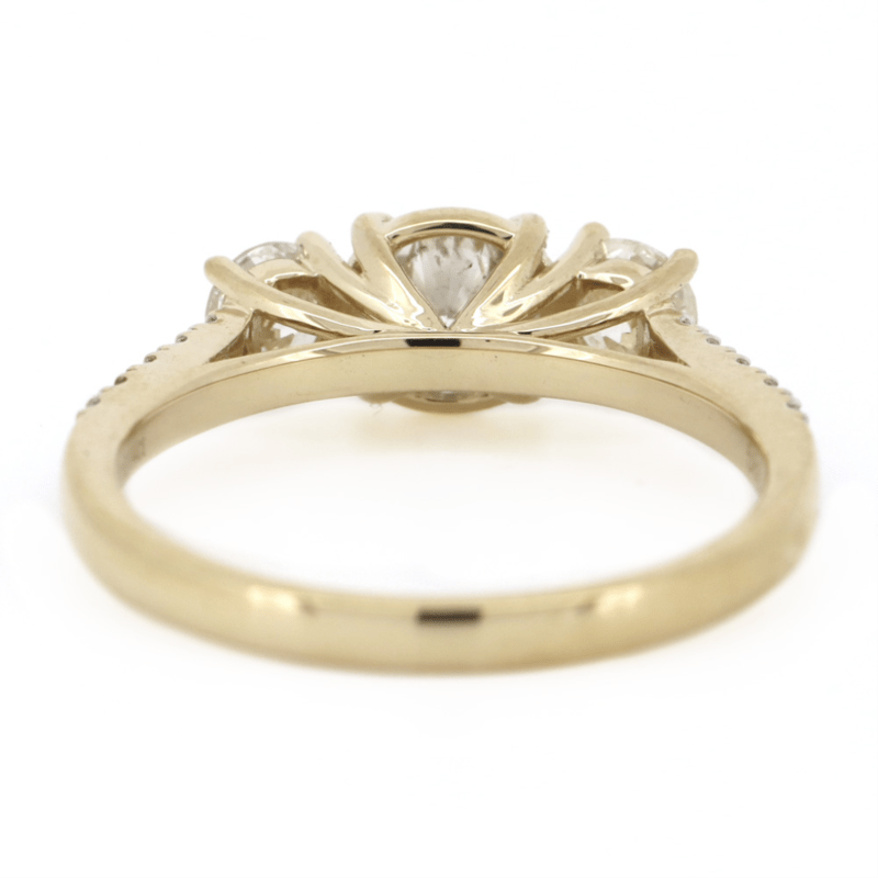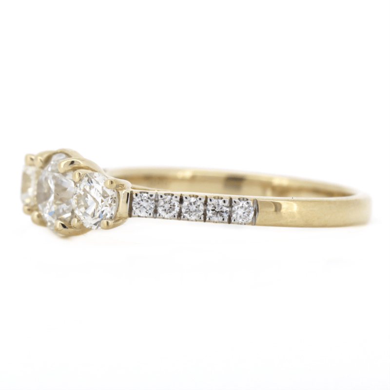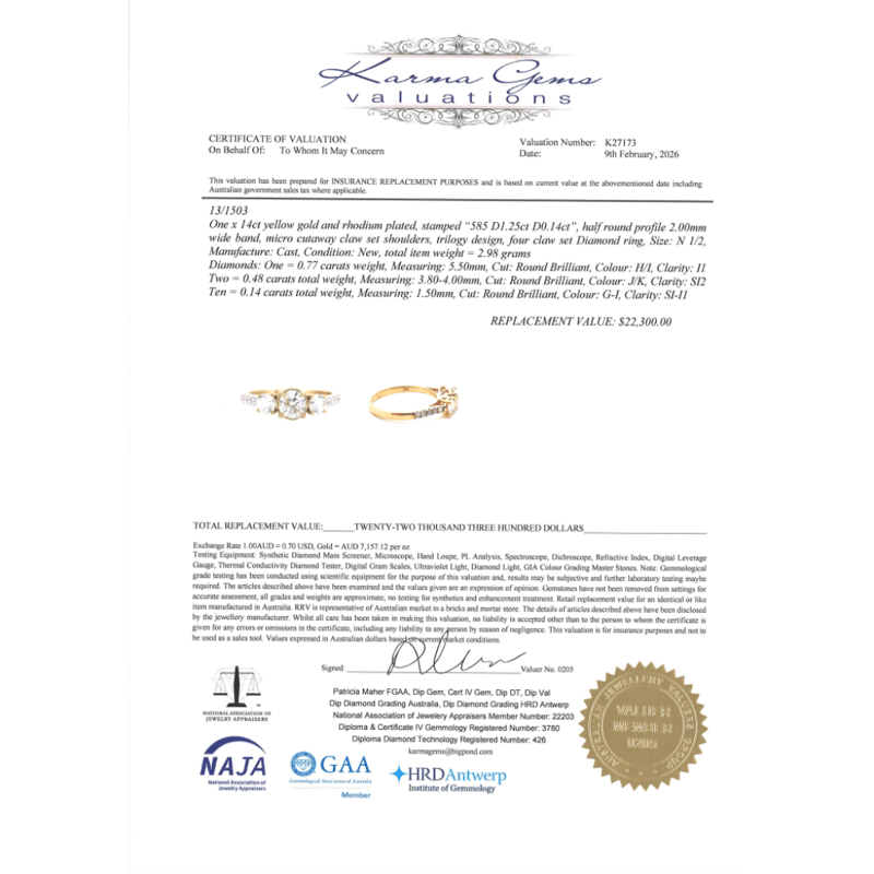 14K YELLOW GOLD AND DIAMOND, CLASSIC TRILOGY RING. The Centre Features, One Round Brilliant Cut, Diamond (0.77Ct, H-I Colour, I1 Clarity), Claw Set. Flanking The Centre Are, 2 Round Brilliant Cut, Diamonds (0.48Ct Tdw, J-K Colour, Si2 Clarity), Claw Set. Decorating The Band Are, 10 Round Brilliant Cut, Diamonds (0.14Ct Tdw, G-I Colour, Si-I1 Clarity), Micro-Bead Set. Ring Size N 1/2. Valuations Provided by an Independent Third-Party Professional Not Directly Associated With Lloyds Auctions at AUD $$22,300.00This valuation has been conducted by an independent third-party professional. The valuation amount is an assessment by the issuing valuer and does not reflect the auction value of the item. Any inquiries regarding the valuation should be directed to the issuing valuer (refer to contact details on the certificate), as Lloyds Auctions has no affiliation or influence over the valuation, the valuer, or the stated amount. Condition: Good - Refer Images 0645975+58
