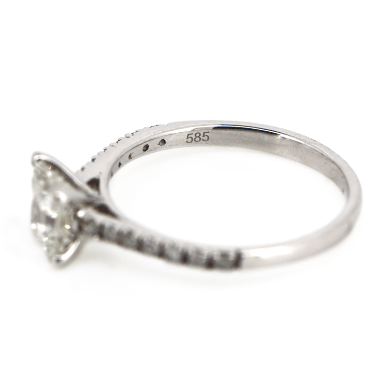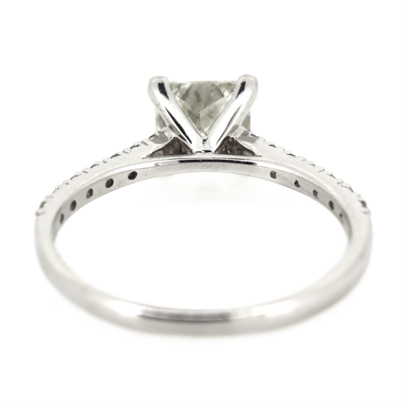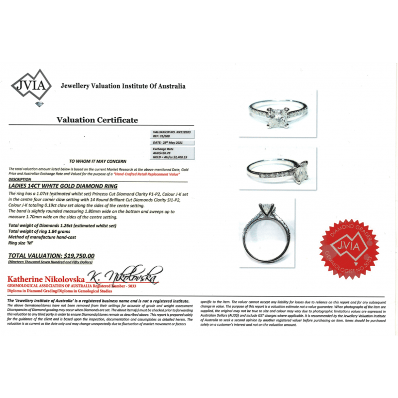 14K WHITE GOLD AND DIAMOND, CLASSIC RING. The Centre Features, One Princess Cut, Diamond (1.07Ct, J-K Colour, P1-P2 Clarity), 4 Claw Set. Decorating The Band Are, 14 Round Brilliant Cut, Diamonds (0.19Ct Tdw, J-K Colour, Si1-P2 Clarity), Claw Set. Ring Size M. Valuations Provided by an Independent Third-Party Professional Not Directly Associated With Lloyds Auctions at AUD $$19,750.00This valuation has been conducted by an independent third-party professional. The valuation amount is an assessment by the issuing valuer and does not reflect the auction value of the item. Any inquiries regarding the valuation should be directed to the issuing valuer (refer to contact details on the certificate), as Lloyds Auctions has no affiliation or influence over the valuation, the valuer, or the stated amount. Condition: Good - Refer Images 0645975+63
