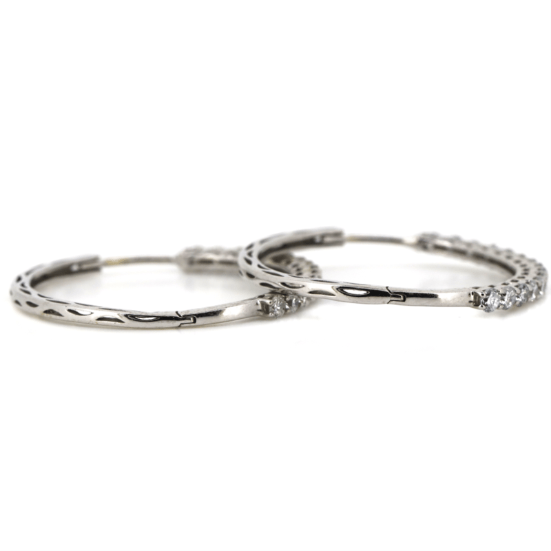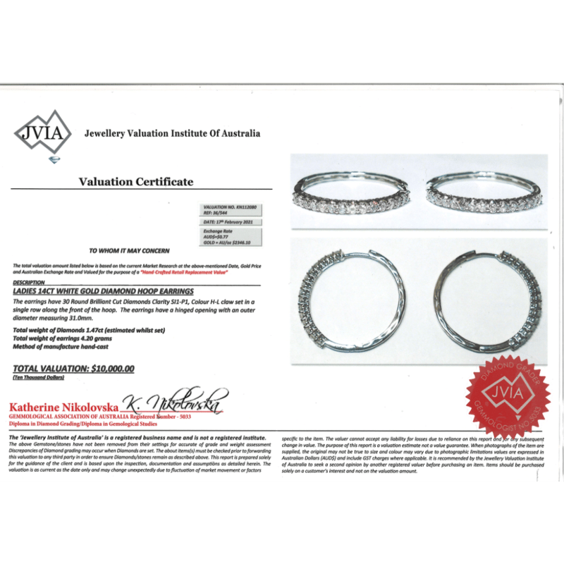 14K WHITE GOLD AND 1.47CT TDW DIAMOND, HOOP EARRINGS. The Earrings Feature, 30 Round Brilliant Cut, Diamonds (1.47Ct Tdw, H-L Colour, Si1-P1 Clarity), Claw Set. The Earrings Feature A Hinged Opening. Valuations Provided by an Independent Third-Party Professional Not Directly Associated With Lloyds Auctions at AUD $$10,000.00This valuation has been conducted by an independent third-party professional. The valuation amount is an assessment by the issuing valuer and does not reflect the auction value of the item. Any inquiries regarding the valuation should be directed to the issuing valuer (refer to contact details on the certificate), as Lloyds Auctions has no affiliation or influence over the valuation, the valuer, or the stated amount. Condition: Good - Refer Images 0645975+64